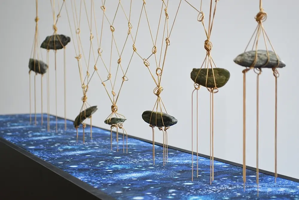 Header image: Ayesha Green, For Morrie (detail), 2018. Gold snake chain, various Pounamu on loan from Otago Museum, fabric and hardboard. Image courtesy Blue Oyster Art Project Space.