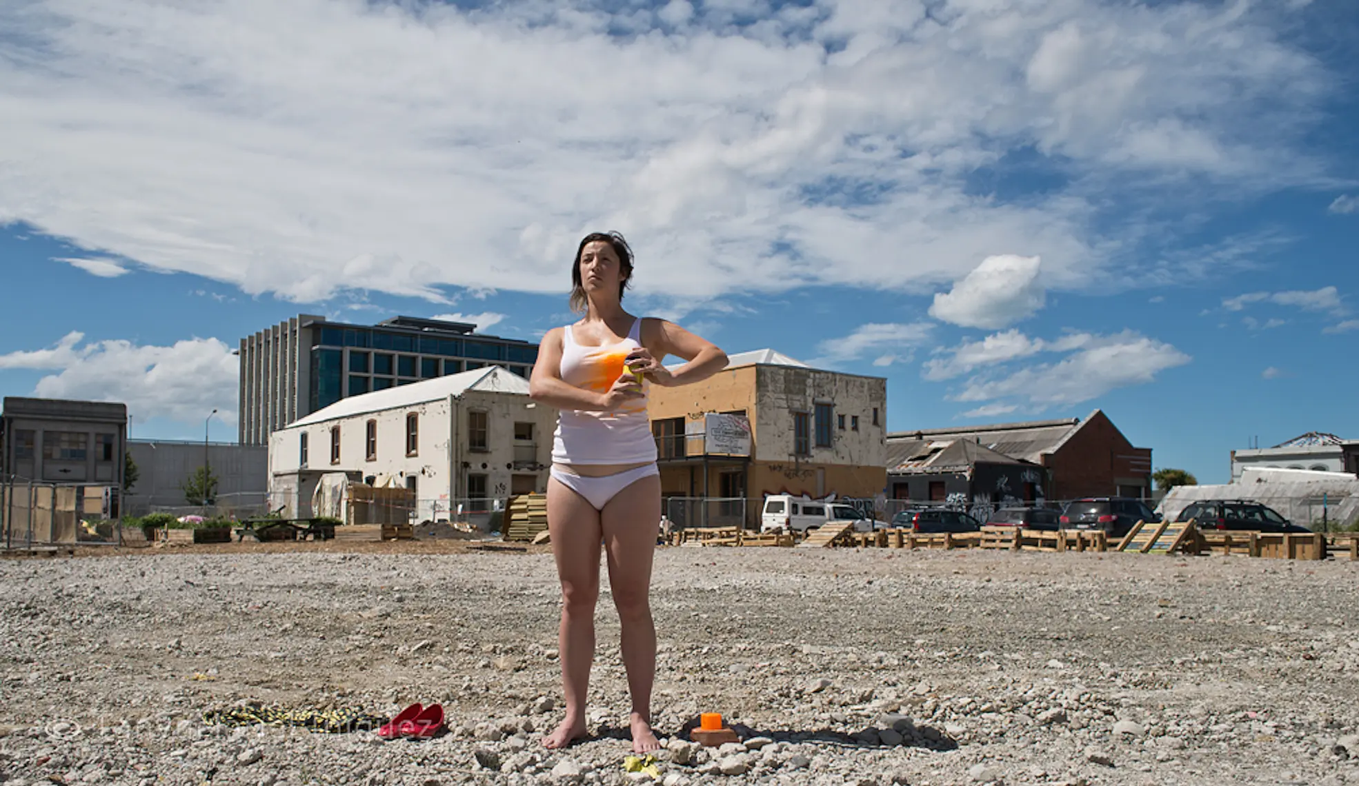 Audrey’s work draws attention to her body as a space in contention, and much of her work is performed on contentious spaces in the CBD. “The personal is political; the body is a good symbol for geography. People are always fighting over the right to spaces.” In ‘Target’, Audrey stood on a vacant section in front of Agropolis Urban Farm and painted her underclothes with orange spray paint, ‘high visibility’ being the prevailing uniform of central Christchurch. It was in part related to her own experiences with objectification but is relevant to every woman in a city now largely populated by male construction workers.