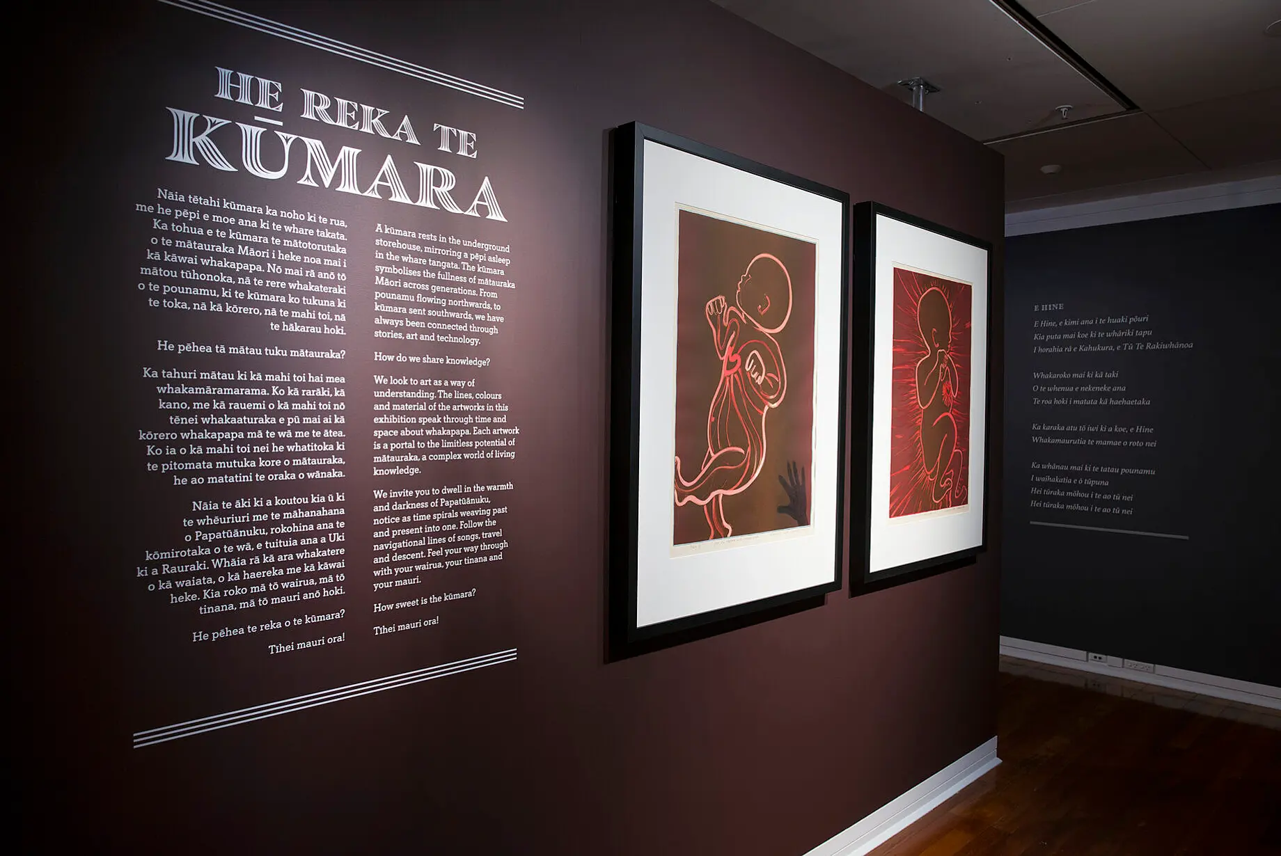 He reka te Kūmara is built with pre-existing work, including some of the most significant figures of recent Māori art history, and houses a complex layering of artworks, objects and texts. In addition to prints by Webb is a suite of life drawings by Ralph Hotere (Te Aupōuri, Te Rarawa), a large-scale vanitas photograph by Fiona Pardington (Ngāi Tahu, Kāti Mamoe, Ngāti Kahungunu, Clan Cameron of Erracht), an amorphous polystyrene sculpture by Peter Robinson (Kāi Tahu), and pendants and wall drawings by Areta Wilkinson (Ngāti Irakehu, Te Hapū o Ngāti Wheke, Ngāi Tūāhuriri). There are maquettes for works by Matt Pine (Te Ātiawa, Te Āti Hau Nui-a-Pāpārangi, Ngāti Tūwharetoa) and Shona Rapira Davies (Ngāti Wai ki Aotea), which link to larger sculptural works outside of the gallery context. Weaving and textiles by Georgina May Young (Te Upokorehe, Whakatōhea, Irish) and a moving-image work by Aydriannah Tuiali‘i (Ngāpuhi, Ngāti Hāmoa) represent a younger generation of practice featured in this exhibition. Also included is writing by HK Taiaroa (Ngāi Te Ruahikihiki, Ngāti Rangiwhakaputa), digital resources supplied by Ngāi Tahu iwi organisation Kotahi Mano Kāika, and a reading room.