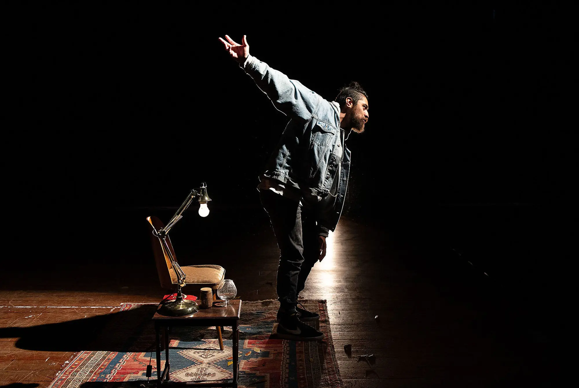 I see an old frayed rug with a wooden chair, a table with a glass of water and a lamp, in the centre of the auditorium. The lights dim and now it’s dark and we, the audience, have gone quiet. There’s a hum in the air and then the lights come back up, and Shadon Meredith is now sitting in the chair, hair tied into a topknot. He’s wearing casual clothes and what I think are Nike kicks, but I can’t be sure, and he looks cool, effortlessly cool, confident. Immediately, there’s this sense of something in the air. I can’t put my finger on what it is and then I realise it’s warmth. There’s a warmth to this performer, to this performance, and it’s not just the orange tinge emitting from the lamp. He begins speaking. “You, my little boy, are the life-giving sun.”