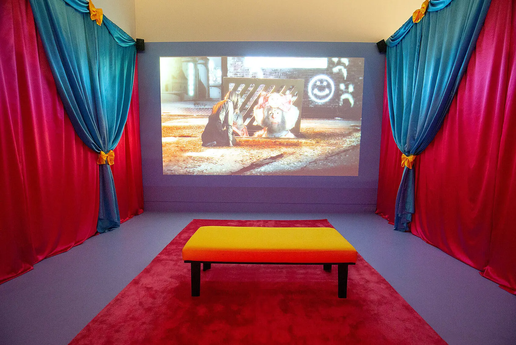 The work is brilliantly clever. And it makes me feel ill. What is the responsibility of the gallery with a work like this? There’s a content warning outside the room. Both the room and the sign are dressed in satin, with big colourful bows and curtains. The sign says, “This film contains strong language and disturbing adult themes that may not be suitable for younger visitors.” It’s the wrong warning. Firstly – IT IS NOT SUITABLE FOR CHILDREN. Also, people who are older may have experienced, and might be traumatised by, the horrible places and manipulation this work shows us. A content warning should state clearly what is contained, enabling a fully informed, consensual choice. We all need protecting, and we don’t get protected by sugar coating and not quite telling the truth.