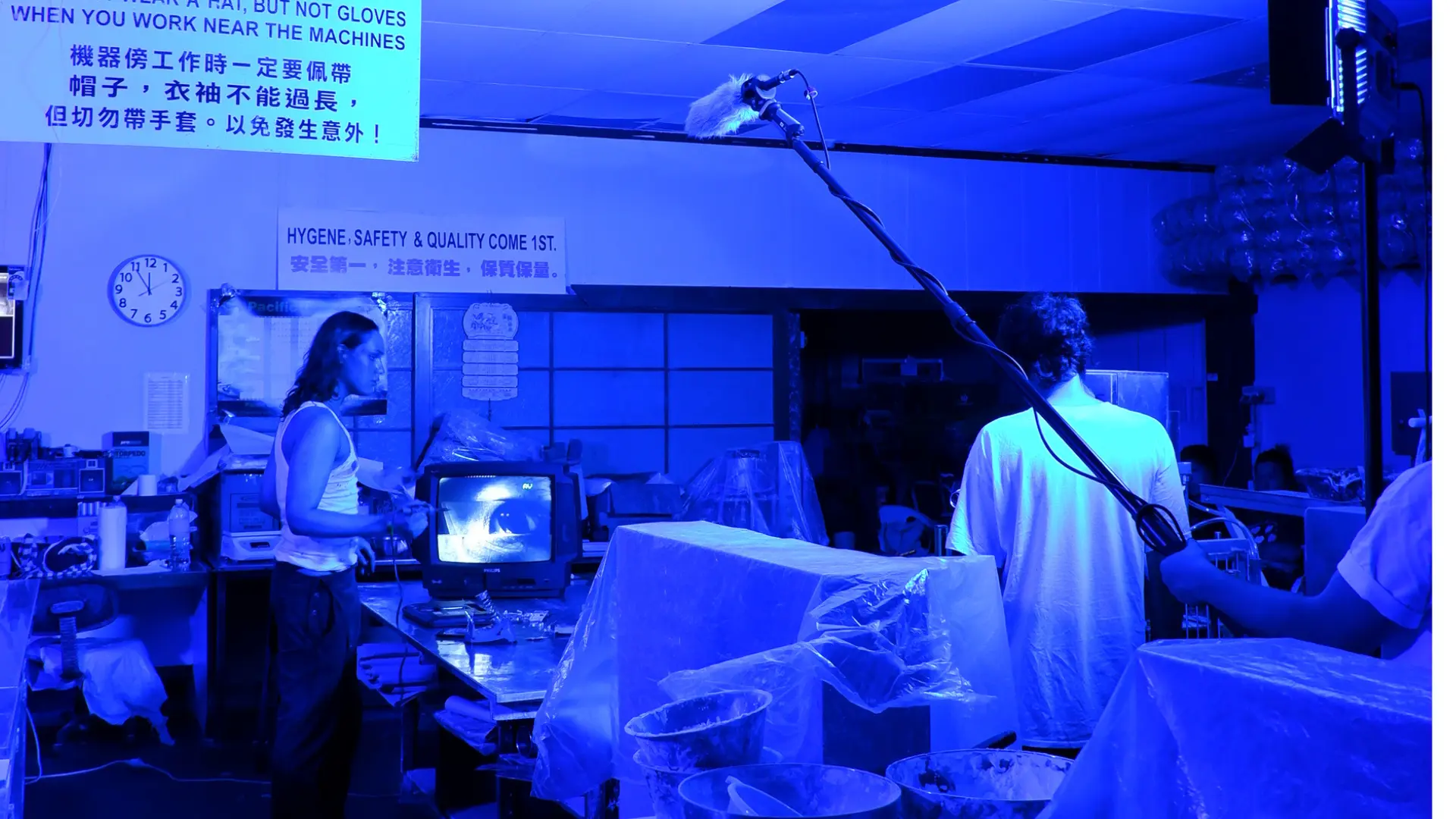 Body Shop’s industrial-warehouse vibe is thanks to producer Kevin Shen’s uncle’s noodle factory Chan Kee, based in Ōtāhuhu, a family business that’s been supplying pastry and noodles to local Tāmaki Makaurau restaurants since the 1980s. This serves as a thread to the other three videos in Niu Gold Mountain,which are all set in retail, food and restaurant establishments vital to BIPOC communities in Tāmaki Makaurau. The cold lighting and the workshop mise-en-scene come together to make it feel claustrophobic – cramped, cyberpunky 80s industrial energy that permeates so much trans art. It’s not scary to us, “it’s not horror”, our worlds have already ended, we’re in the process of building new ones, starting with ourselves.