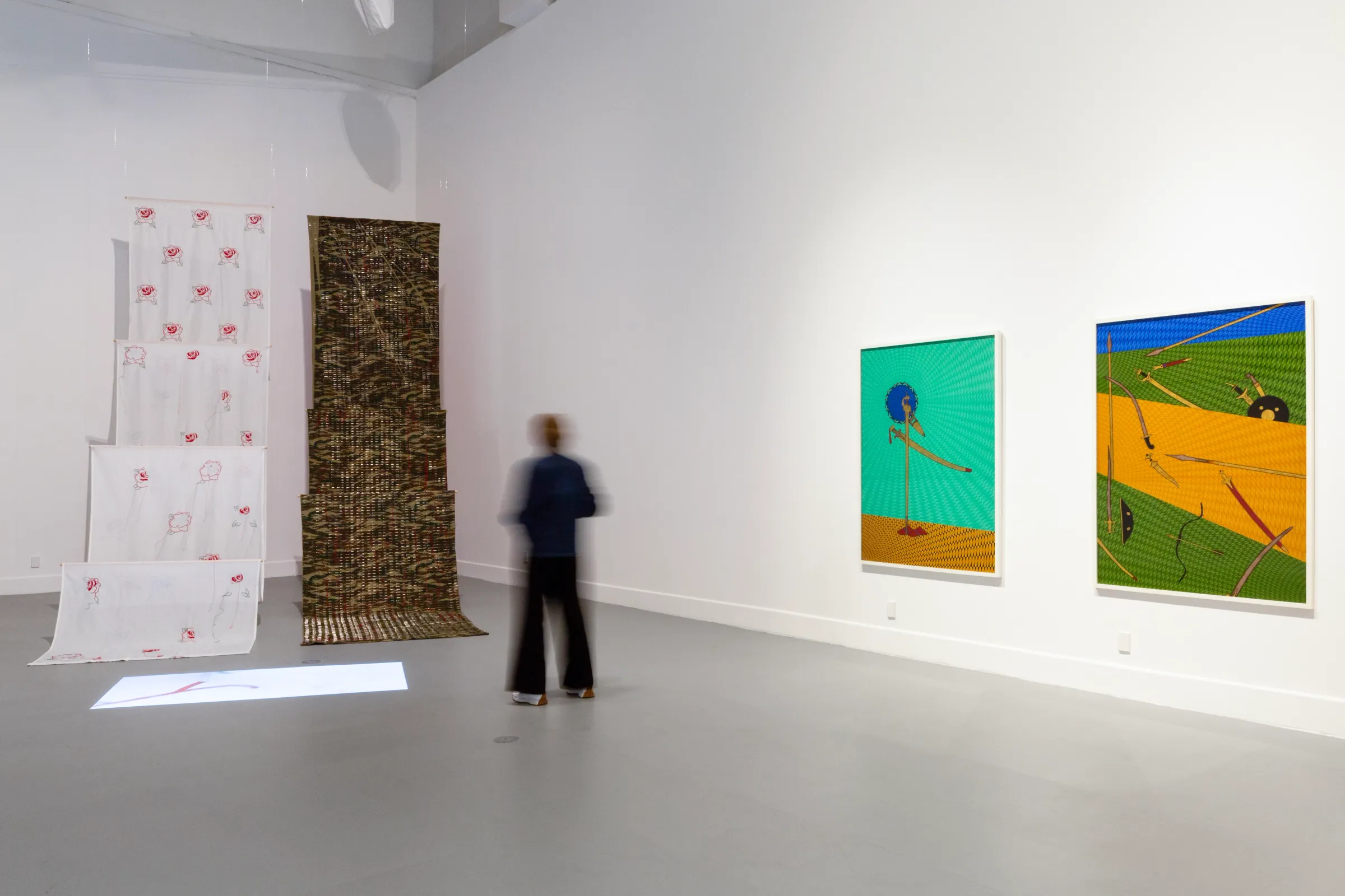Khalid was taught to embroider and stitch at a young age by her mother, and both of these mediums appear in some form across all her work. In Time and Patience (2013), two lengths of fabric roll towards a video projected onto the floor. The left, in white, has red embroidered flowers flowing down – some finished, some unfinished. The right, in a camouflage print, is pierced by long steel needles. Both are left in an incomplete state. The work speaks to the heavy taxes placed on Bengali muslin by the British during the Industrial Revolution, effectively destroying an industry and the livelihood of hundreds of thousands of Bengali. In the video work Conversation (2002), two screens play at the same time – a conversation between the East and the West. The piece was created while Khalid was completing her master’s degree in Amsterdam. A brown hand embroiders a rose on the left screen, while a white hand brutally unpicks all the work on the right. It is a direct response to the stereotyping and societal shifts Khalid experienced in a post-9/11 world as a Muslim woman creating art in a country that had no knowledge or understanding of her traditions and culture.