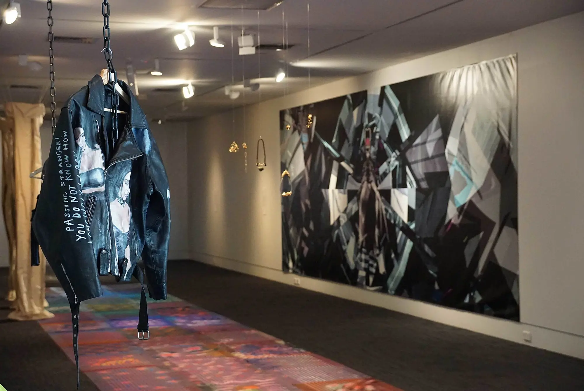 The textiles on display are made more powerful when worn, yet in Dark Objects they lack a sense of embodiment. For Clara Chon / Blue Blank’s Untitled painted leather jacket depicting Kim Kardashian, the label refers to the life it took on when worn by Kim K herself. Instead of working with the bodied nature of that activation, it hangs limply from a chain which again feels like a prosaic rather than nuanced display.