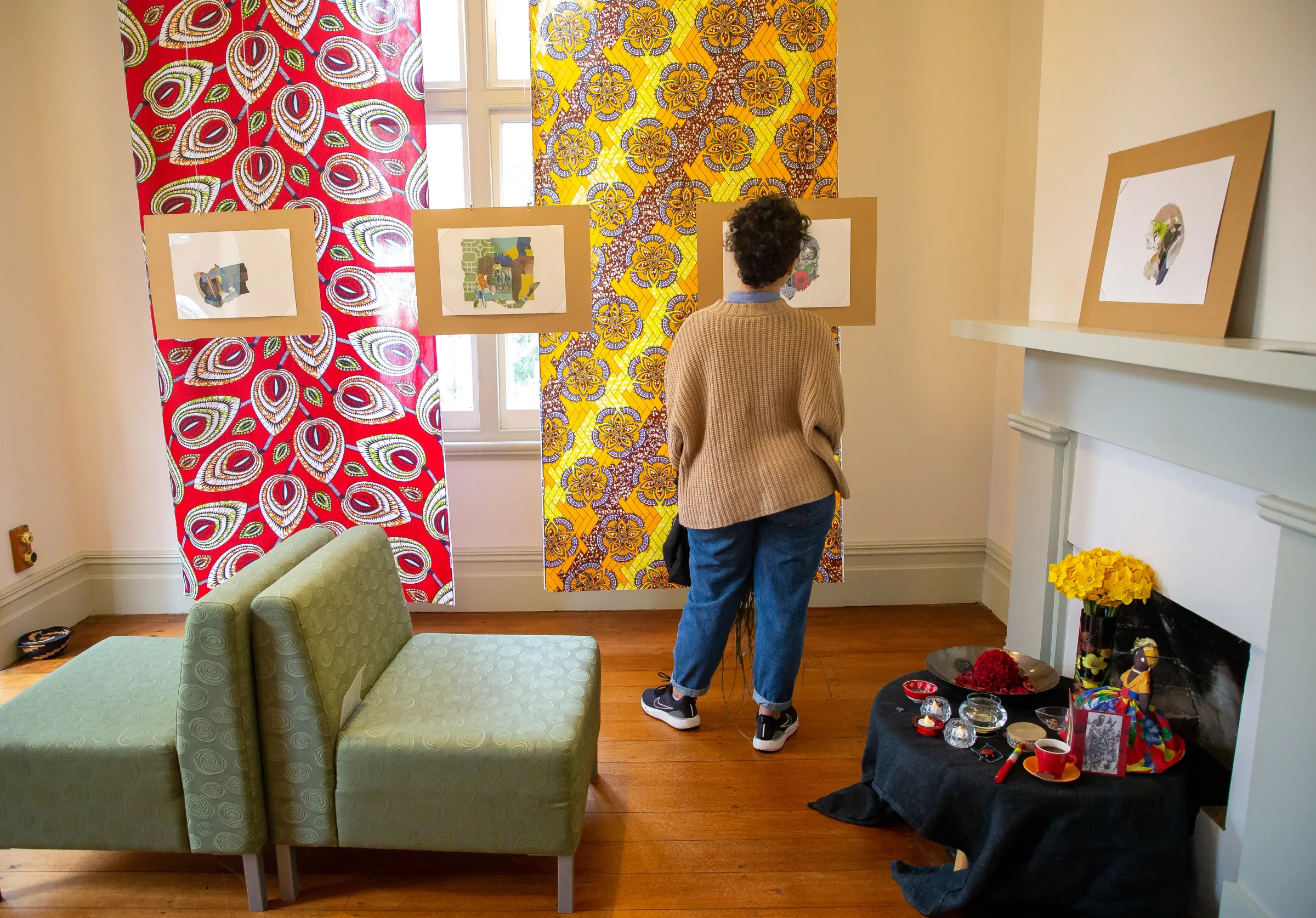 As participants gather, they bring with them their unique stories and perspectives, creating a collage of experiences akin to the artwork itself. All around are African wax prints, known as ankara. These colourful and versatile materials are used for a variety of different purposes, from clothing to upholstery. In the installation, the ankara hang from the three-metre ceilings. They are thoughtfully and purposefully used to adorn the walls, both as vibrant backdrops to the exhibition, and as artworks in their own right. In many of the rooms, ankara prints hang in front of windows that let in abundant streams of light – becoming illuminated like stained-glass windows. In other places, the ankara hang against walls, while other artworks are suspended in front of them.