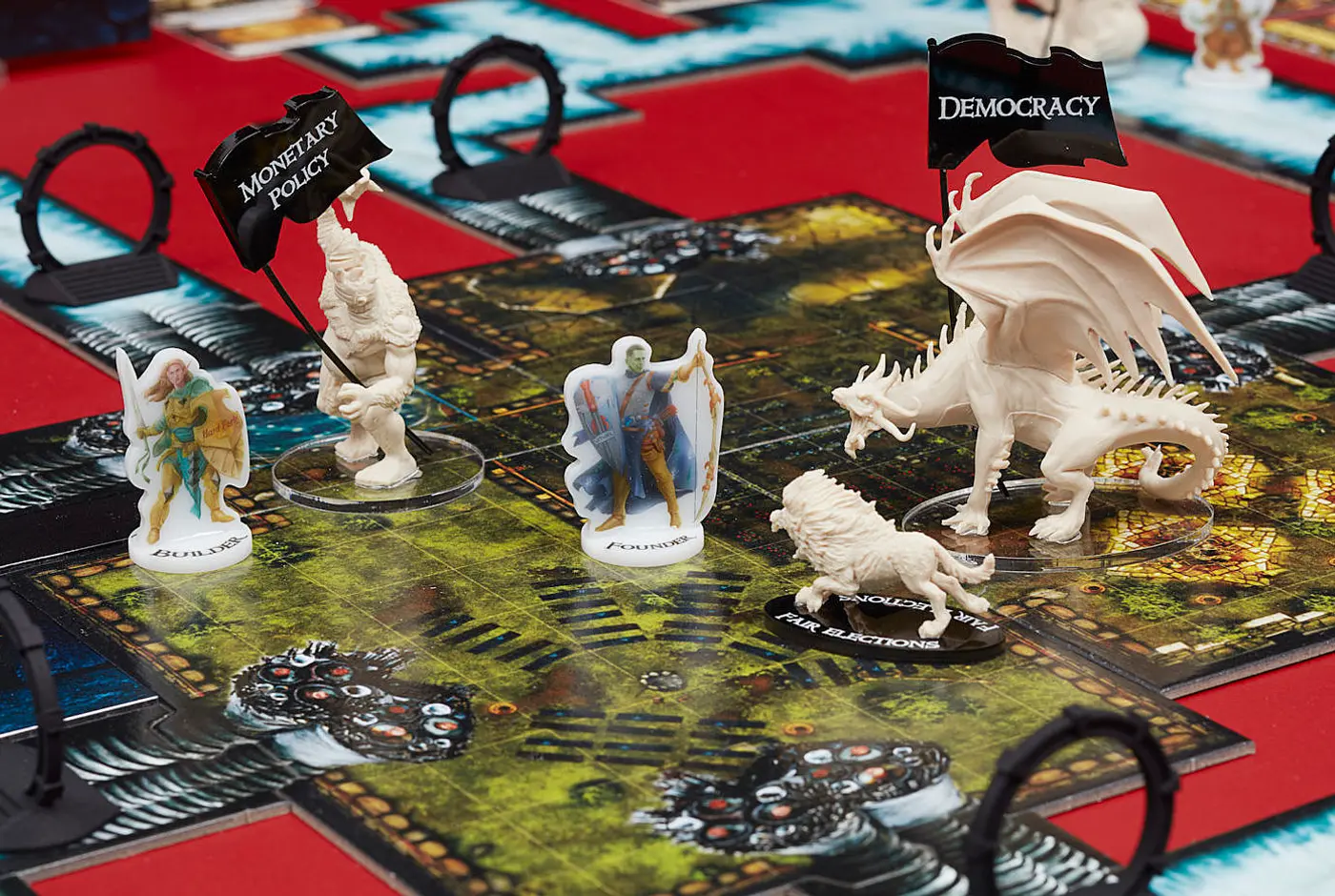 Game of Life is more visually rich than Jenga and Twister; it includes more bells and whistles. This is ostensibly due to the fact that the original is a more complicated game, for older players. However, it also gestures towards a capitalist interest in money and things that is downplayed by Harris. If Twister appeals with its materiality, Game of Life appeals with its materialism. This places it in league with a suite of works created around Descent: Journeys in the Dark, a 2005 fantasy board game cut from the same cloth as the roleplaying game Dungeons and Dragons and the card game Magic: The Gathering. Denny reimagines Descent in more optimistic terms as Ascent: Above the Nation State, in which individualist heroes fight to “Escape the constraints of the Nation State and establish Global Domination”. (Rather ironically, the heroes work together to achieve success.)