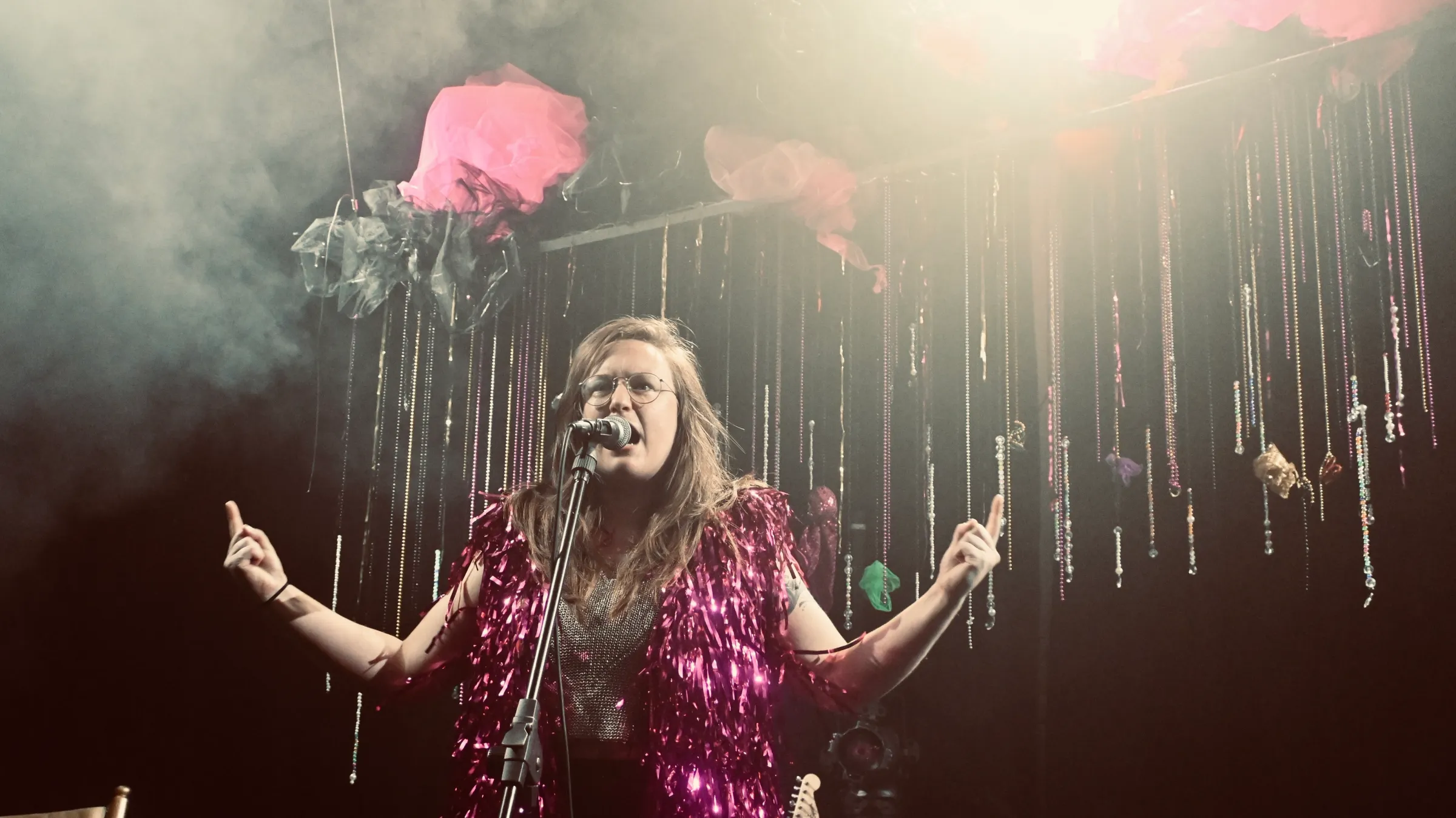 Set and costume designer Sam Ducker-Jones creates a moody lucid dream on stage. The set is 70s-disco-meets-Euphoria-meets-prom. Lighting designer Grace Newton illuminates the stage with several isolated sources of light, including lamps and spotlights. Strategically placed, they bounce off the bejewelled hanging centrepiece and the pink metallic fringe accents on the costumes.