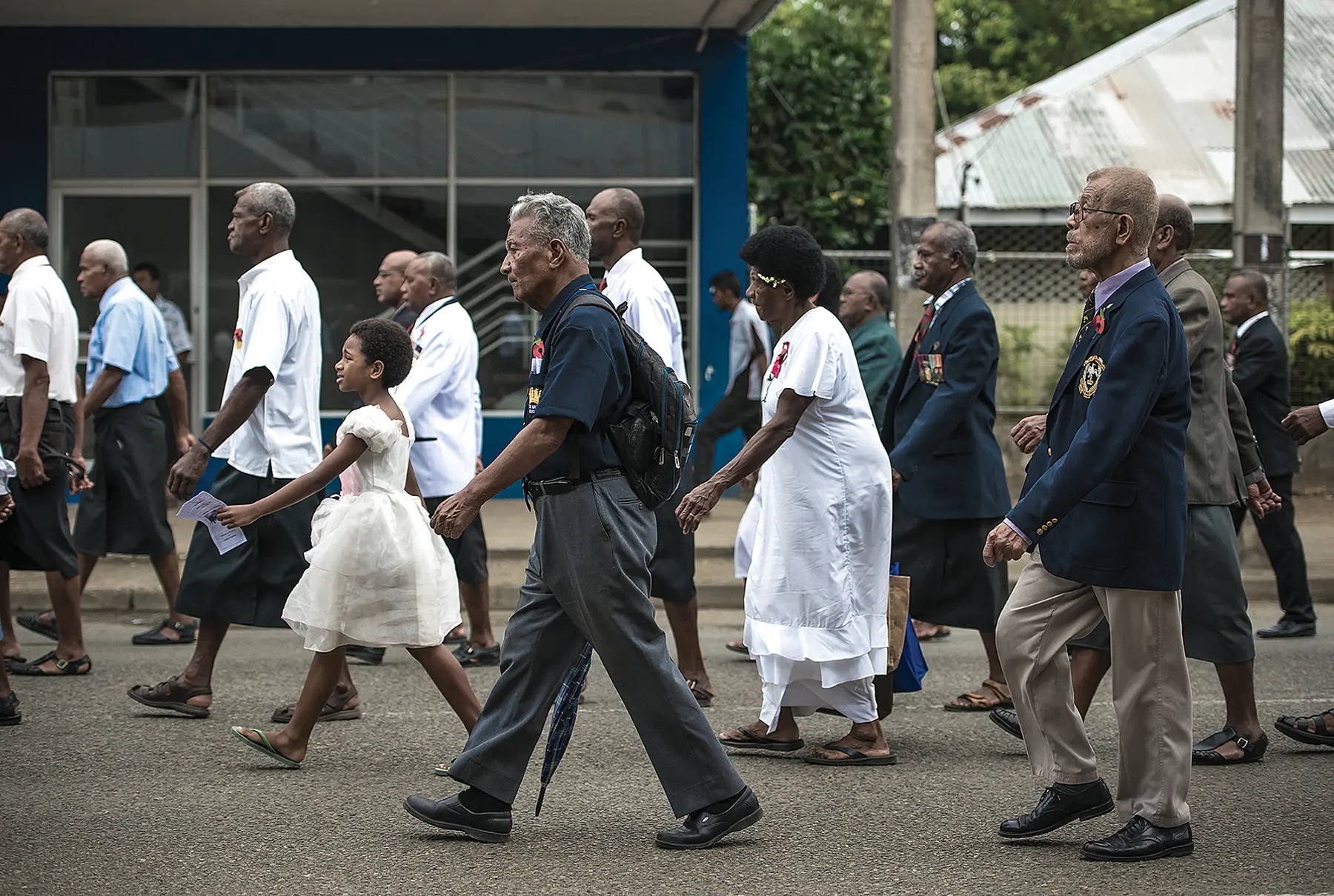 Bolatagici’s Remembrance (Viti) (2016) documents the first veterans’ parade held for these particular soldiers, who witnessed nine tests between May 1957 and September 1958. Framed in white, the photos have both a stoic yet solemn nature. Hands hold a bible, while a Fijian flag ripped at the end blows in strong winds, veterans stand proud in their blazers adorned with military badges and red poppies; men, women and children walk in procession. There’s a sense that the honouring of these men isn’t only a celebration, but also a confrontation with darker times; a sense of a deception and of the conflicting position of being involved in the tests while also being victims and survivors of them at the same time.