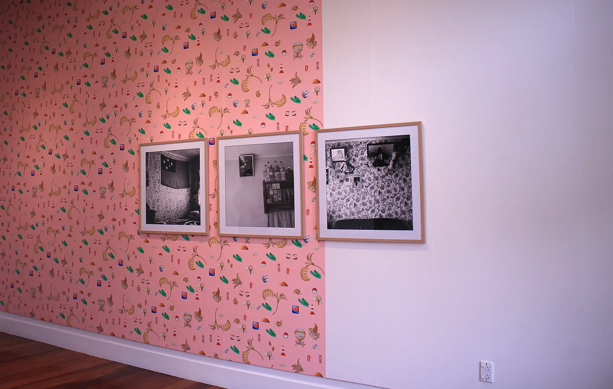 Another exhibition which draws on the community spaces that family houses can act as and contain is I’ll see you at Orion a solo exhibition by Louisa Afoa (Samoa) at Corban Estate Arts Centre (8 September – 22 October). Taking its title from the Papakura street that Afoa’s great Aunty and Uncle lived on, it recalls the family and cultural hub that the home served as for the artist. The exhibition focuses on the rent-to-own state house, with a reimagined wallpaper that includes references to key family objects and motifs of significance. On top of the wallpaper are three photos taken from within the original house, each pulling on interior decoration many Pacific families will be familiar with – the national flag proudly pinned to the wall, family portraits adorned with lei and reproduced drawings of Jesus.