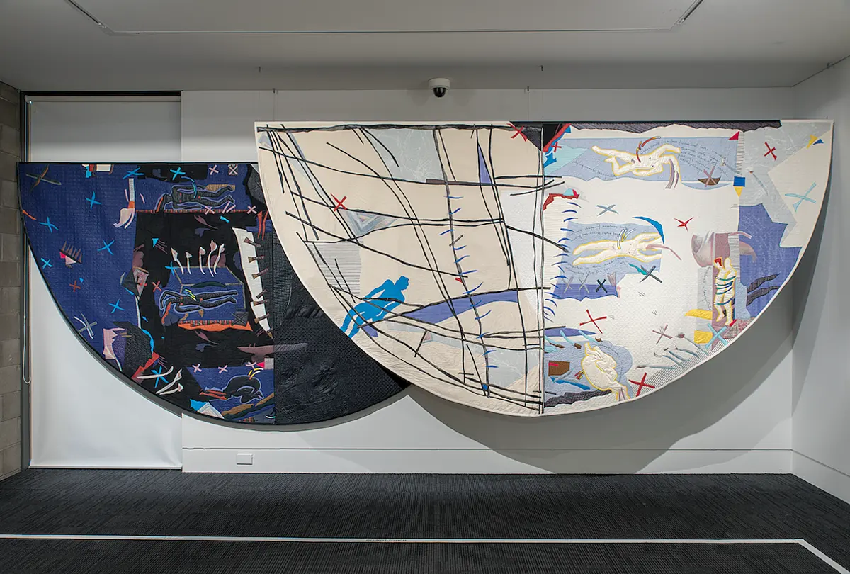Malcolm Harrison, Night Swimmer, 1991, quilted fabric, collection of The Dowse Art Museum; The Letter, 1990, quilted fabric. Collection of Kim Brice, Nelson; AIDS Quilt Dedicated to Simon Morley, 1991, quilted fabric. Collection of Tim McWhannell and Terry Stringer, Auckland.