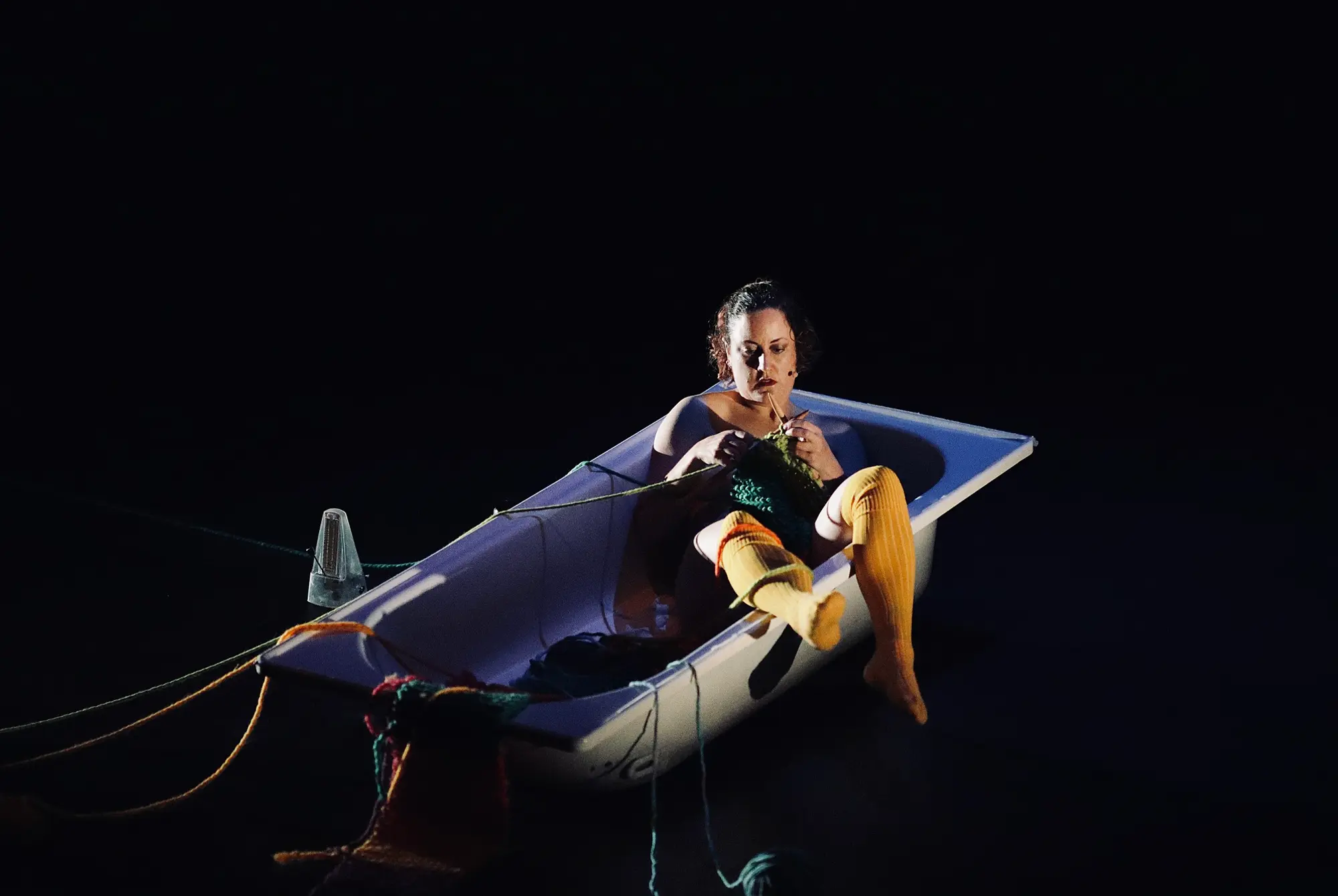 Here is a body, deluged by a flood of their own sweat. They methodically collect their liquid efforts with the slit of a Mastercard, for deposition (taptaptap) in a measuring cup. Here is another body, slouched nude in a bathtub, surrounded by an abundance of brightly coloured wool. They knit with slashing needles and lecture blithely on “slut money”. Here is a third body. This body goes by Harold, and they perform through the Zoom-verse. Harold is a potted plant. Harold, a co-performer explains, is a little shy.