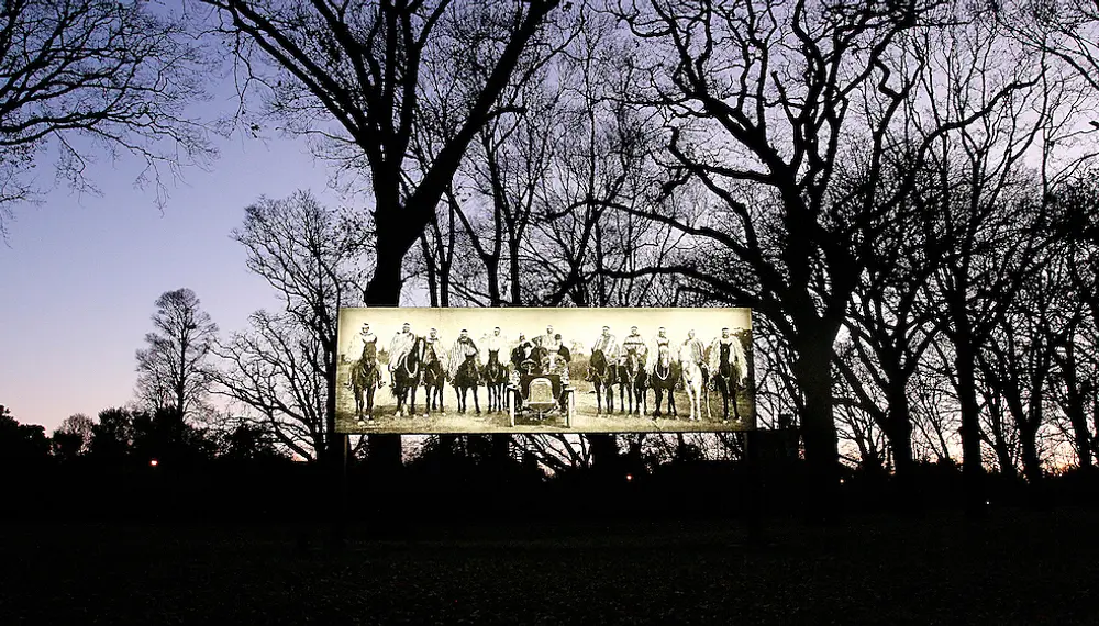 *The day I visited Pohio’s Raise the anchor, while researching this essay, was one of the first autumnal days of the year, the cold wind in the surrounding oak trees mingled with the steady rush of cars moving along Harper Avenue behind me. I was on foot, and the installation felt much further from the road than I first thought; when I stood close to the work, the horse-mounted rangatira seemed to eyeball me back. Pohio later told me that he wanted this to happen, for the fourth wall to break down and for the image to grab the viewer by the shoulders, shake them, and tell them you are here. He hopes this action draws attention to the gap around our history in our education and national psyche. It is important for Pohio that Raise the anchor finds something site-specific to draw a connection from in each location that it is installed. When shown at SCAPE, this was the site of a historic Waitaha urupa and the Bridge of Remembrance near Cambridge Terrace; at Toi o Tāmaki, it was Gottfried Lindauer’s portrait of Hakopa Te Ata o Tū which was hung inside the gallery on Pohio’s request,as part of the work. In Athens it was the Phaleron War Cemetery, where several Ngāi Tahu are buried, and in Kassel it was Jacob Grimm’s drawn copy of Sydney Parkinson’s etching The head of a New Zealander which was found by the artist on the Grims Weld Gallery walls, confirming the decision to install upon the Weinberg-Terrassen. In its current place, Raise the anchor draws some of its significance from Little Hagley Park, historically where Māori would camp when visiting the fledgling Ōtautahi, and where a massive Ngāi Tahu delegation camped when they brought their case for a land and reserves claim to the Native Land Court in 1868.