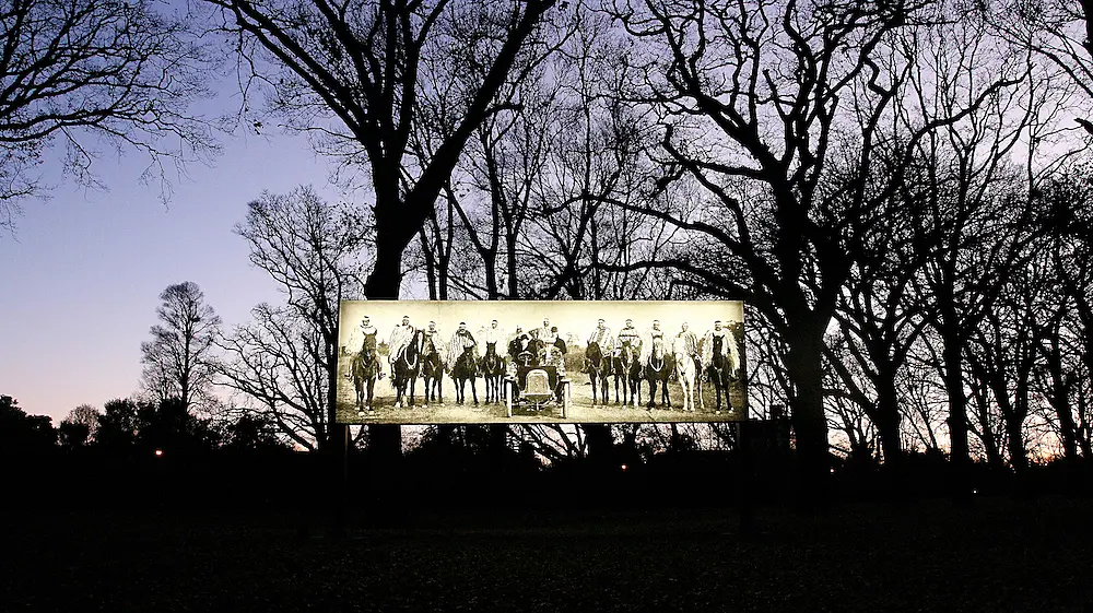 Around four months before the exhibition opened, Raise the anchor, unfurl the sails, set course for the centre of an ever setting sun! (2015) – a nearly two-and-a-half-metre-high, eight-metre-long photographic installation by Ōtautahi-based artist Nathan Pohio (Waitaha, Kāti Māmoe, Ngāi Tahu) – was given a permanent place in Little Hagley Park near Harper Avenue in Ōtautahi. Raise the anchor has travelled long to get to here, from Memorial Park in Ōtautahi in 2015, where it was first shown as part of SCAPE 8; to the forecourt of Auckland Art Gallery Toi o Tāmaki for the 2016 Walters Prize; then to the EMST National Museum of Contemporary Art in Athens, Greece, where a new version featured a second archival photograph taken at the same time but previously unused by the artist; and to Weinberg-Terrassen in Kassel, Germany, for documenta 14. The original photograph Pohio sampled for Raise the anchor dates from a 1905 issue of the Canterbury Times, just after the time period that unfolds in Hidden Light. In it, horse-mounted Ngāi Tahu rangatira in ceremonial korowai and kākahu stand in a row directly facing the camera, flanking Lord and Lady Plunket – the then-Governor-General and his wife – who sit in a small motorcar. Both Hidden Light and Raise the anchor have a quiet, yet insistent, historical resonance that emanates from the photographs that Hall has brought out, and that Pohio has reconfigured on a monumental scale as a public artwork. This resonance, although subtle, can hold our attention when we look, as the subjects depicted are suddenly immediate. They show us a past that is present, but is typically invisible to the naked eye.