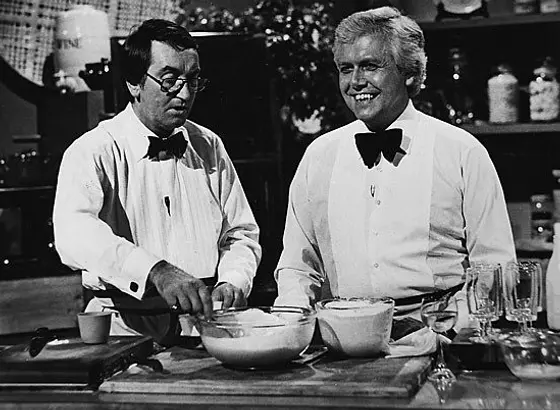 By 1980, they had moved to a late-night slot: half the time, twice the booze, and many a velvet bowtie. Their unscripted verbal slapstick and riotous, clanging cookery made them a ratings success and alongside their show they released a slew of cookbooks, hosted a morning radio show, opened a restaurant, and were awarded Entertainer of the Year in 1981.