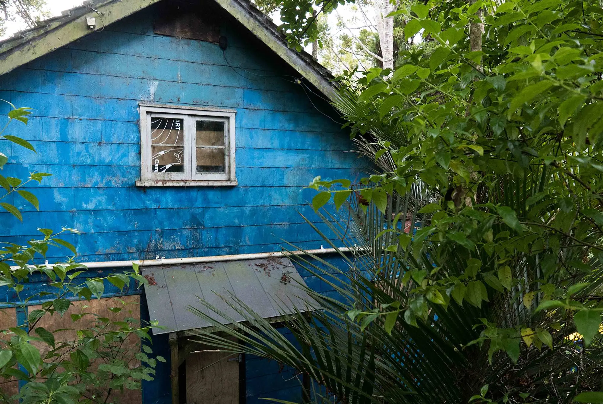 The house is three stories tall, with a small water tank on the house’s right, and two balconies on the second and third floors. Down a small slope out the back is a long drop. The gutters were filled with leaves, the windows and doors all boarded up. It looked soaked through.