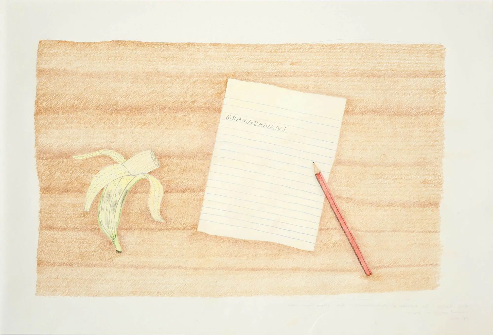 He was a nail biter in his youth. In adulthood, a painter of envelopes, and fridge notes, of boxes and concrete poetry. Austin likes to play word games and his elusive art has been said to borrow from the logic of ideograms, crosswords, puns, jokes and concrete poetry.[1] The Invention of Banagrams (2015) is a picture drawn in coloured pencil on paper of a writing pad and an HB pencil at rest. The handwriting on the pad reads: GRAMABANANS. Nearby is a partially peeled banana, its yellow nib missing. Austin’s work flirts with literalism, insisting everything is and isn’t what it seems. His acrylic paintings are rendered in a deceptively guileless manner evocative of the candid illustrations in certain children’s picture books. He also sculpts: Unfinished Couch (2017) is a life-size pink two-seater made out of polystyrene and papier-mâché. The left arm of the couch has been left incomplete, as though waiting to be “coloured in” and thus fully imagined. Empty couches recur in Austin’s paintings as spaces to travel and dream.
