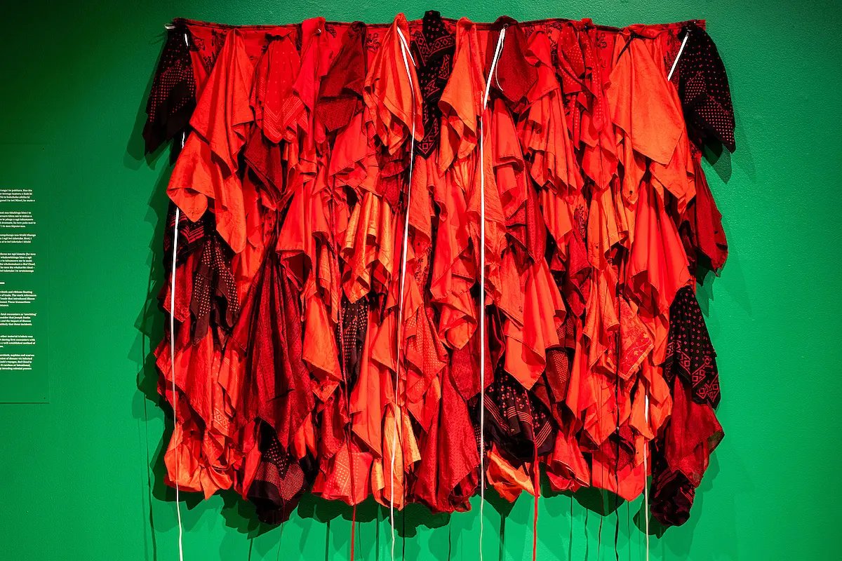 Many elements of emotional and physical turmoil, their reality and impact, surface in other interpretations of this encounter. However, the realities and impacts, although interpreted through a human perspective, also affected the environmental and cultural perspectives – all peoples, environments and sites that this voyage touched. We witness the non-human impacts of this voyage through works such as Bill Hammond’s Unknown European Artist, 2004, and then the coming together of both environmental and emotional impact is captured in Megan Jenkinson’s The Florentina Pectora (Flowering Heart), 1987. Physical implications, illness and disease are explicitly articulated by blood-stained handkerchiefs and napkins, and the hanging strands of ribbon that remind me of the all-too-common notion of mourning and sadness – whilst assembled in such a way that seems from a distance to resemble a kākahu Māori, or Māori cloak. People clothed with illness, disease and sadness, all the while using a napkin to wipe their sadness, and gifting ribbon empathetically to those they visited in different places.