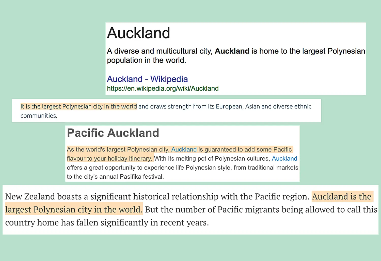 The definition of Polynesian in these three examples is markedly different to its contemporary use, which in my interpretation excludes Mana Whenua from the Tāmaki Makaurau region. The exclusion of Māori from the “largest Polynesian city” line means that the phrase has become interchangeable with the term Pacific, becoming completely detached from its original use and inception (although it is important to note that Polynesian in and of itself is a problematic term and colonial way of dividing the Pacific Ocean, but we’ll save that for another time). This is clear in contemporary uses, which contextually align with the promotion of events such as Polyfest and Pasifika, Pacific migrant exceptionalism (like the claiming of Joseph Parker despite the lack of financial investment in his campaign), and boast of Tāmaki Makaurau’s Pacific communities in the promotion of our city’s tourism – all while using the line “largest Polynesian city.”