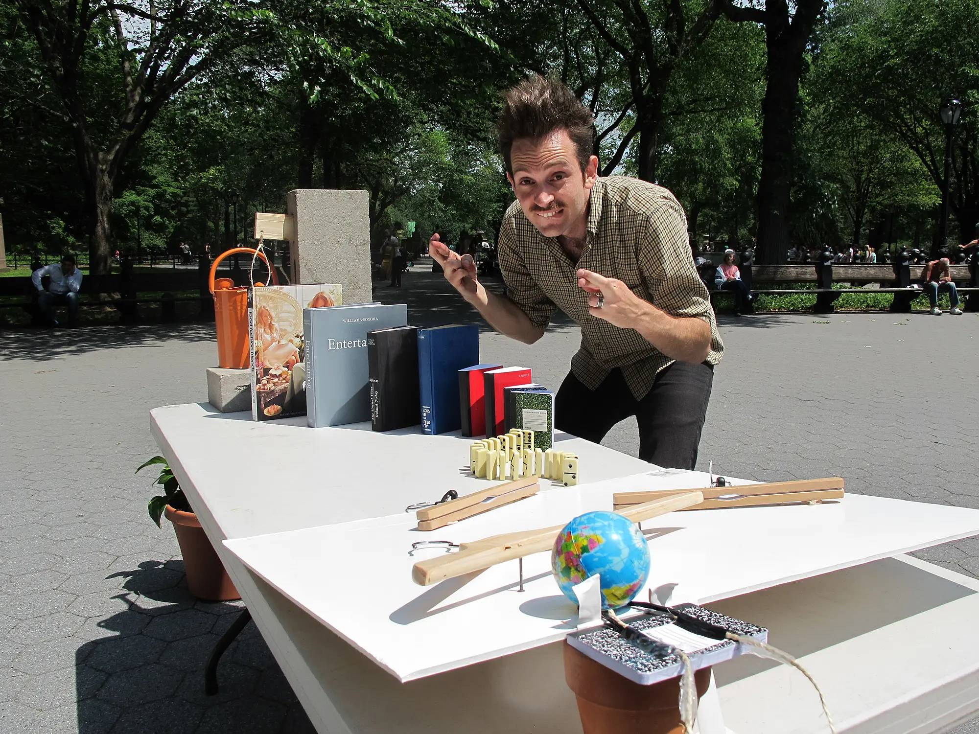 Through his dad, the right to go Stateside beckoned, and our flat soon disbanded. This drove him to New York in his mid-20s, where he pursued a ‘real job’ in software development. It wasn’t long, however, before he was drawn back to inventing. Eventually, he abandoned his career altogether to make his Rube Goldberg machines full-time. Opportunities soon arose. Joseph’s work was included in the Venice Biennale. He starred on Sesame Street and was featured in the New York Times. His journey as a modern-day Rube Goldberg had begun.