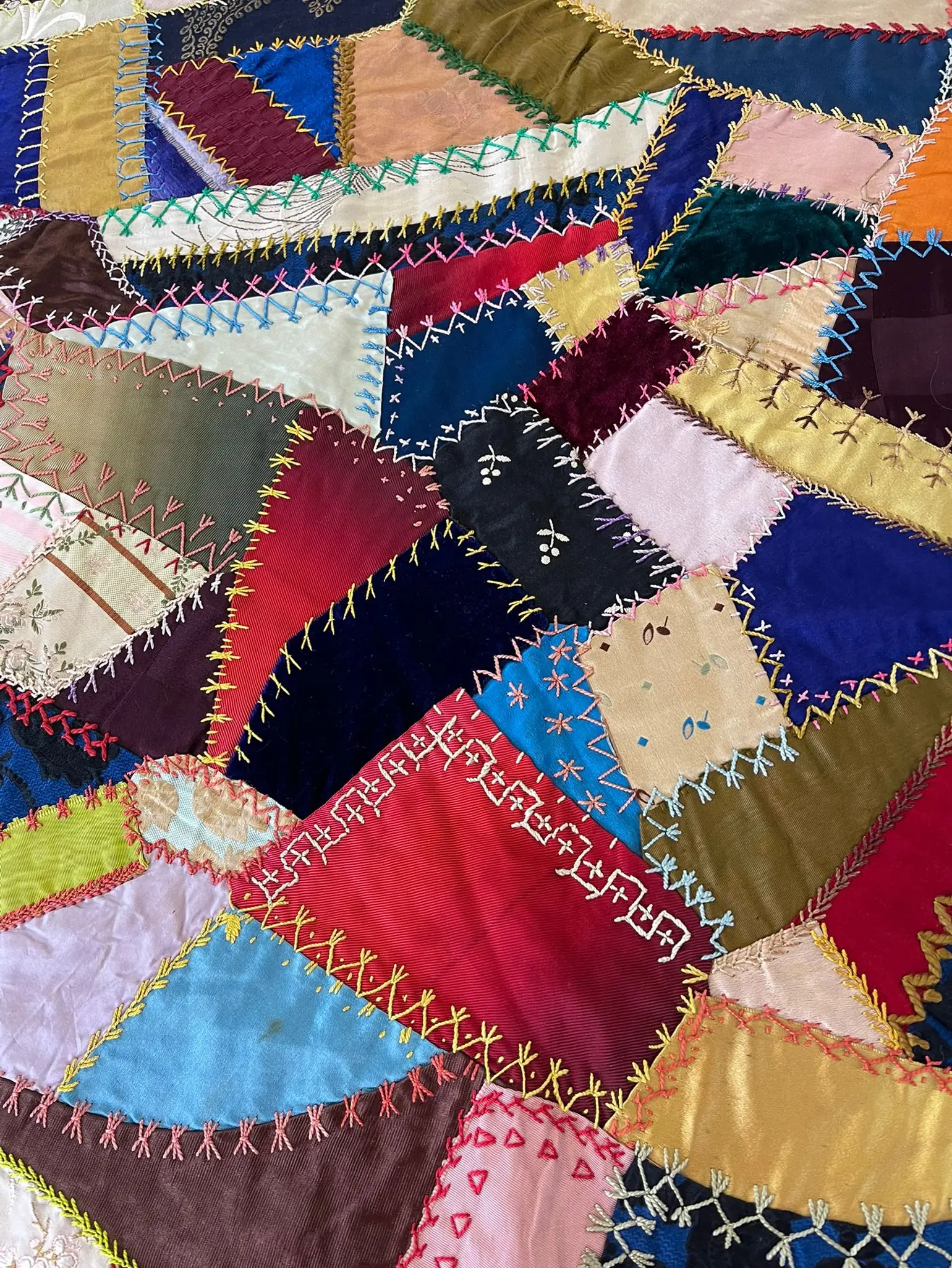 Here we offer up a second piece of work to explore these questions. This time, it’s on the page rather than in a gallery. It takes the form of a metaphorical crazy quilt. The crazy quilt is constituted of disparate fragments, carefully pieced together, and held in place by an array of hand-embroidered stitches. Colours may clash, the pattern may be crooked or confounded; however, when you follow the path of stitching, we hope you will find a complex harmony.