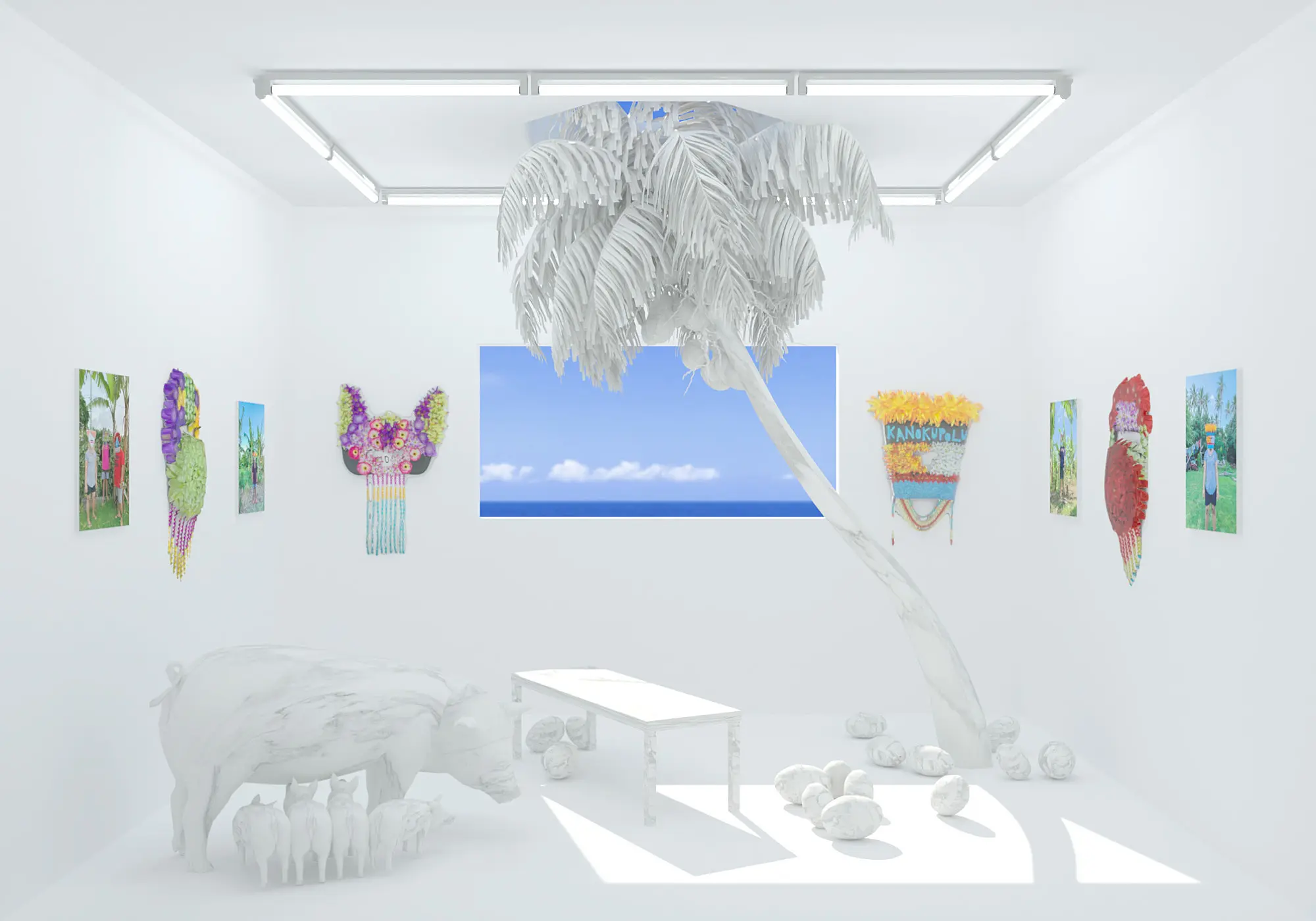 We are brought into a space, by Sione Tuivailala Monu. A space they have created. It is mostly white. A blank space of paleness. A white coconut tree stretches to the digital ceiling. There is a sow, her pigs are suckling, the sow is white and the pigs are white. There are coconuts strewn across the ground, they are also white. Different kinds of milk, in different kinds of bodies. There is a seat to sit on. A place to find rest, to breathe deep in the things we can taste and touch. The seat is also white.