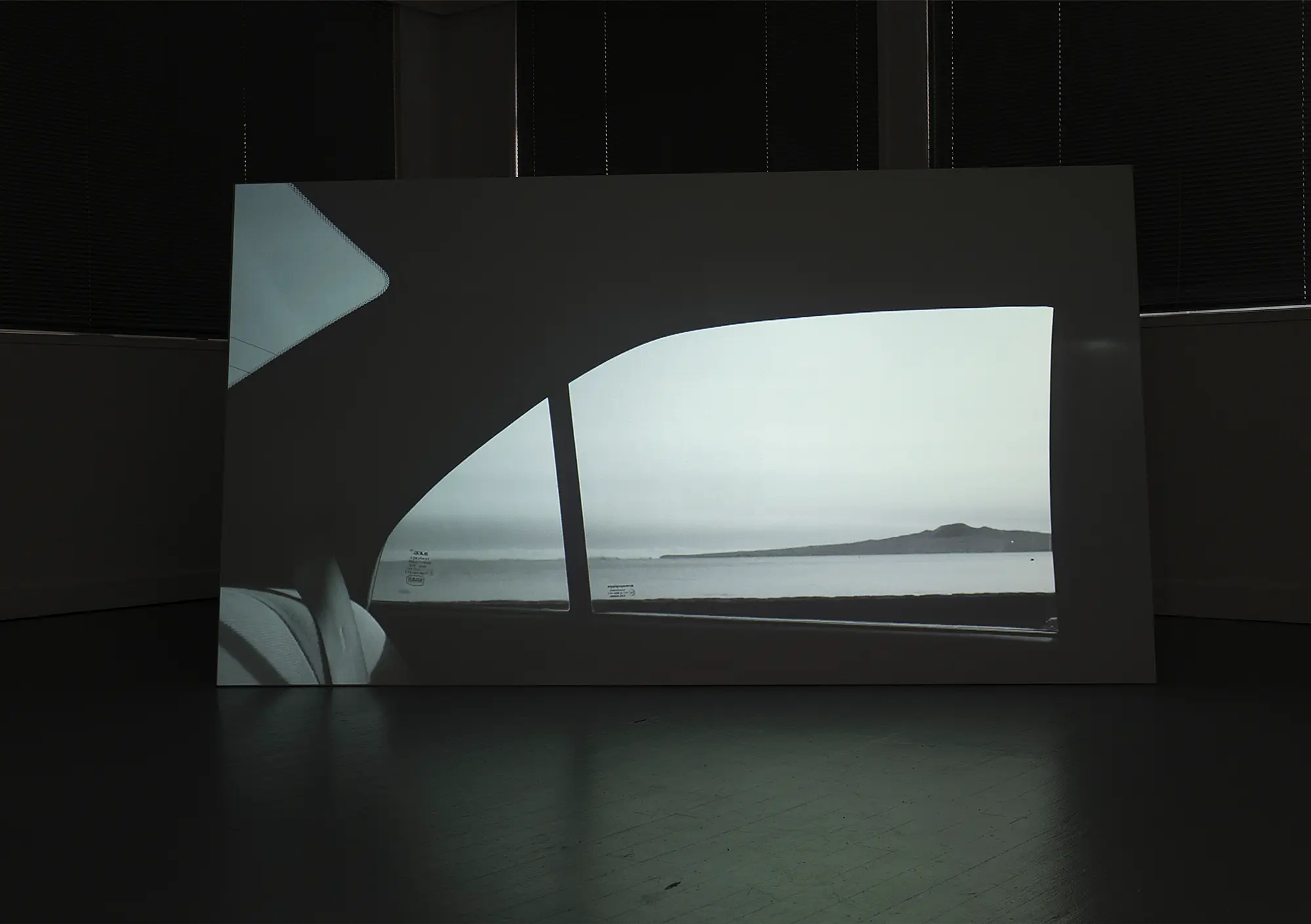 Skies seen from below feature heavily in the work. There are upside down horizons, black trees and blue skies encircled by halos of golden light. There is the familiar isthmus perspective of Rangitoto seen against a clear backdrop from a moving car. The vertebrae of a vapour trail against powder blue. A view of above mediated by lace-like trees. Passive/active, the point of view of being driven, lying back and distractedly observing.