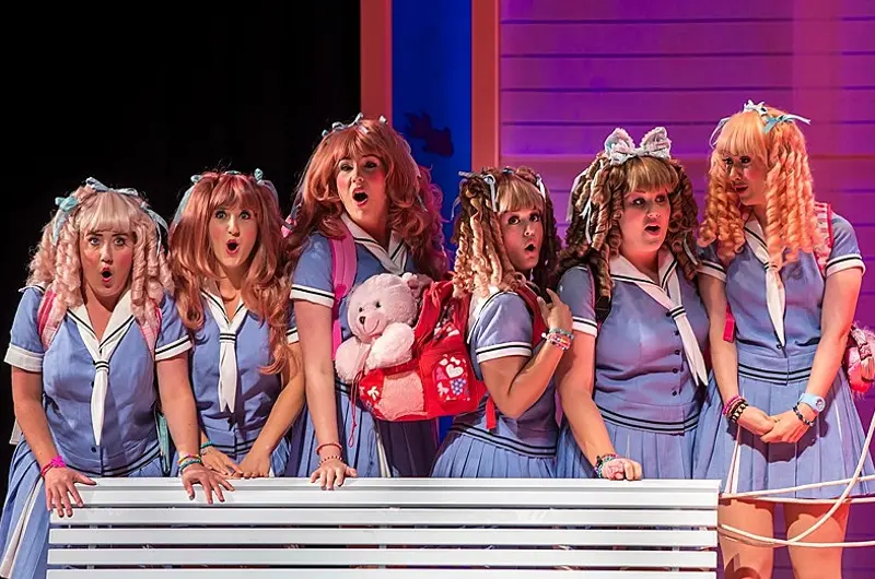 Firstly, there’s the straight-out stereotype: the women’s chorus are presented as little more than sex-crazed Japanese schoolgirls, complete with pink curly wigs and school uniforms, running around like meerkats. Perfectly packaged bundles of misogyny and racism for our gratification. The constant fawning over anything male, and the intermittent squealing, quickly become cloying. Just because anything Hello Kitty is cute doesn’t make it less offensive.