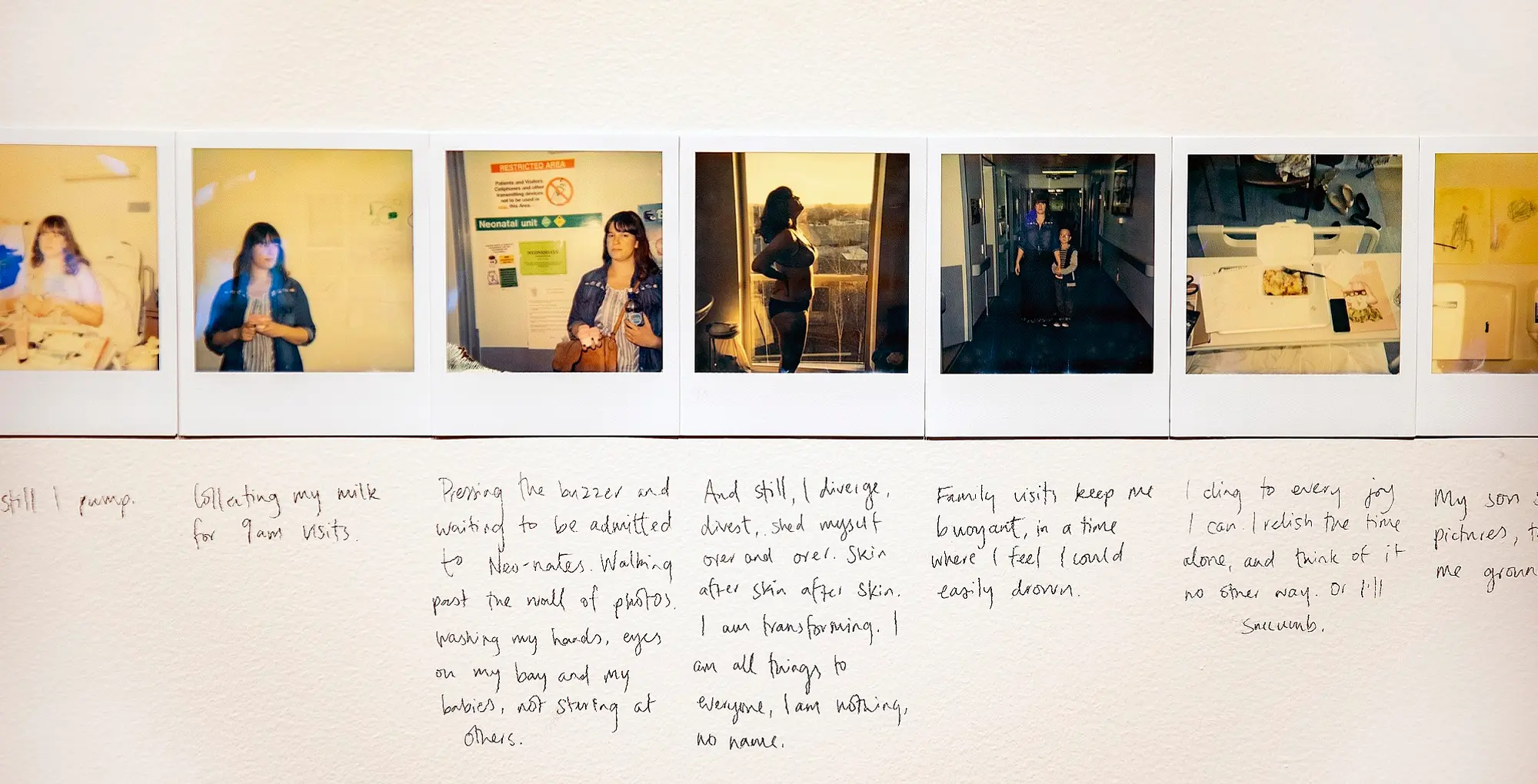 M/other features works by ten artists. Each contribution represents the wholeness of a world that I could delve into, empathise with and, this is rare, see myself in. First to capture my attention was Vessel (2016) from Leala Faleseuga. Comprised of over 100 Polaroids with accompanying hand-written text, it is a documentation of the artist’s experience of pregnancy with twins. The highly romanticised, sepia toned medium of the Polaroid is juxtaposed with Faleseuga’s raw text. This is a storied work, the artist taking with you on her journey of being a house, a home, a vessel, a mother of three, a carrier of life, including her own. Vessel is a work that begs your presence, a work that the word ‘visceral’ wishes it could encapsulate.