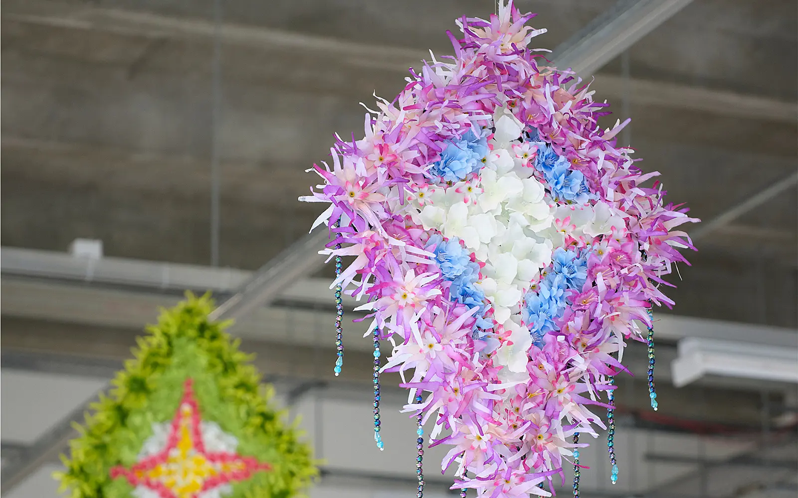 In Gallery Two there are two new works: Matariki Fetu‘u (2020), by Sione Monū, is suspended above Banig – Fala (2020), an unfolding mat work by Julia Mapusua, Sharon Semi-Tugia and Denise Jilian Saso. Matariki Fetu‘u can be thought of as a star map, a sculptural representation of the Matariki open star cluster. I count nine stars – the number observed by some iwi – as opposed to seven indicated by the Seven Sisters of Greek mythology. Sione’s stars are part of a continued experimentation with nimamea‘a tuikakala, the Tongan fine art of flower design used for making kahoa/garlands. The divine constellation is here enshrined with the artist’s signature use of bright plastic flowers and beads collected from Māngere and Ōtara township dollar stores.