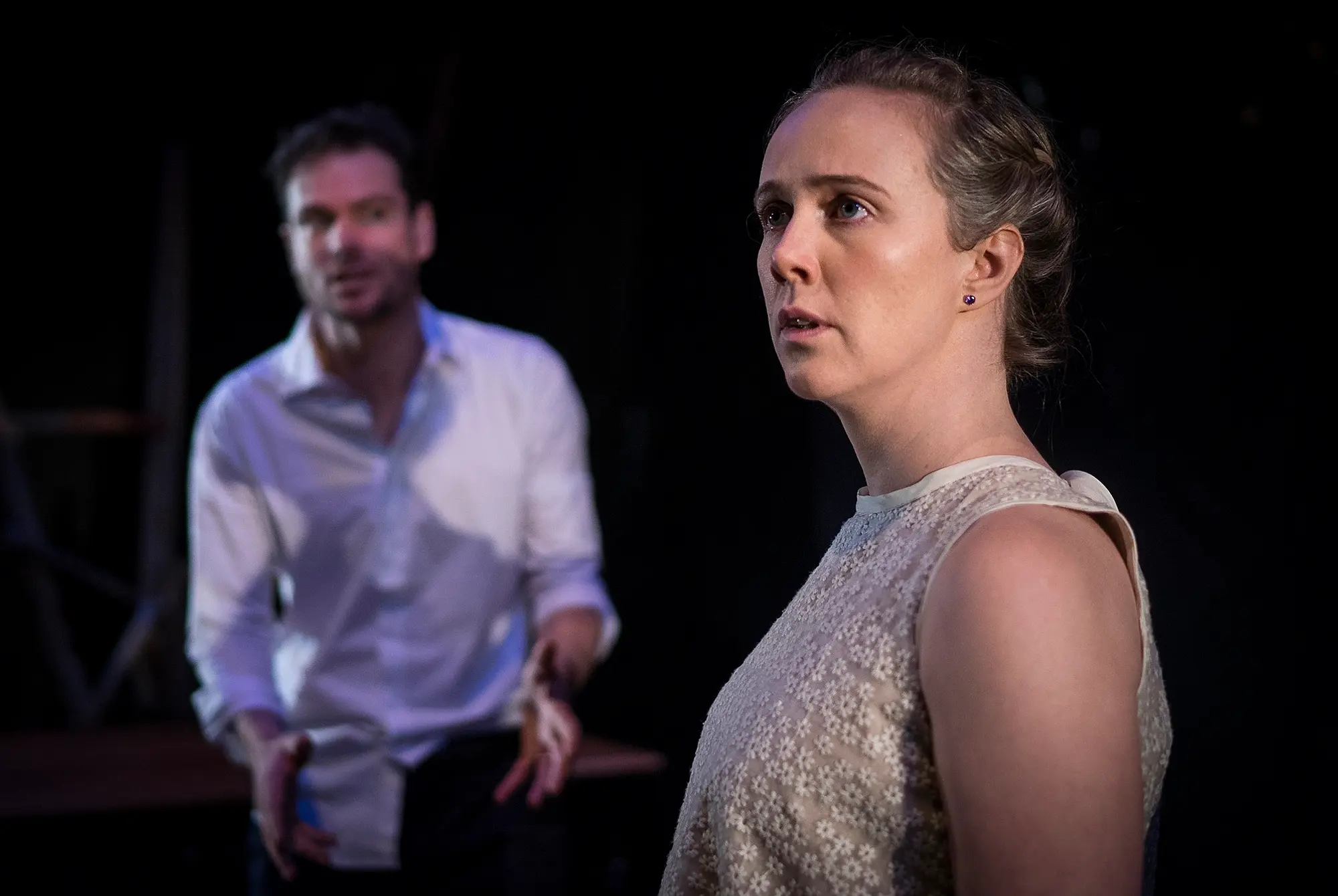 Ian Harman's set is comprised of saw horses, trestle legs, bulbs and frames suspended from the roof and giving the impression of renovations. There are some design elements I don’t quite understand, such as tissue paper and lollies falling from the heavens. Is this a whimsical touch or a metaphor for what awaits this picture-perfect family? Vocal performance is sometimes an issue; from where I sit it’s difficult to hear the child performers, and some of Meeks’ and Biggs’ dialogue. However others are distinguishable and easy to follow; the hard brittleness of Christine is reflected in Kopae's voice, and McCauley's Gerry has a particular slur.