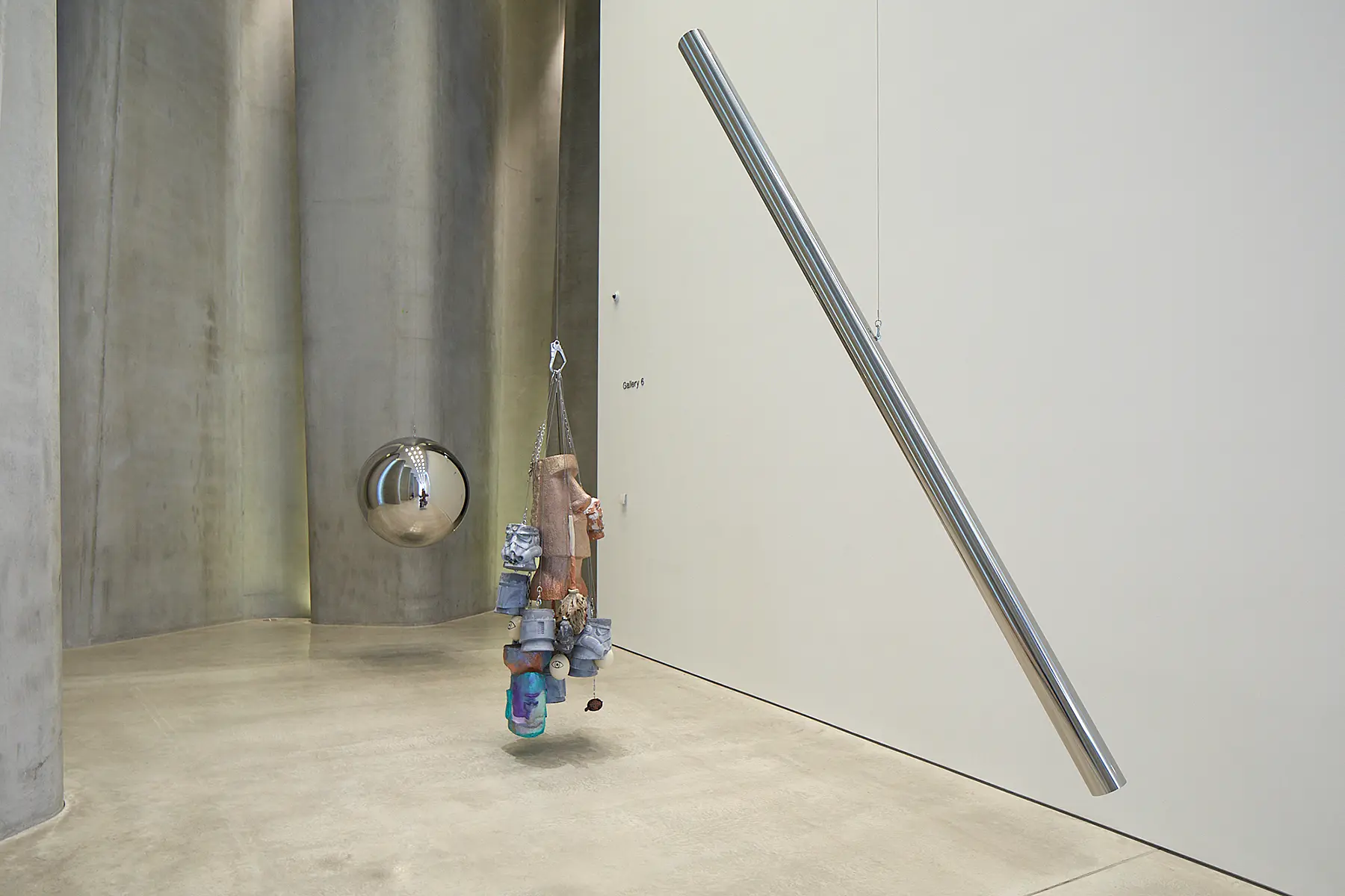 After this mobile, which glints as it turns, is a long stainless-steel pipe on a dynamic diagonal. A replica of the tall steel drainpipe in the far corner of the East Ramp, its surface is shiny and outer-spacey. Placed not far from the zero-gravity apple, the pipe makes me think of the spinning bone in Stanley Kubrick’s 2001: A Space Odyssey (1968), which is tossed into the sky and then graphically matched to become a spaceship. My invocation of the history of cinema and science fiction is deliberate: Earthcraft is certainly not straight minimalist sculpture nor merely a lesson in geometry. As a quest it is far from straightforward; as an artwork it operates in a complex spatio-temporal and fictive way.