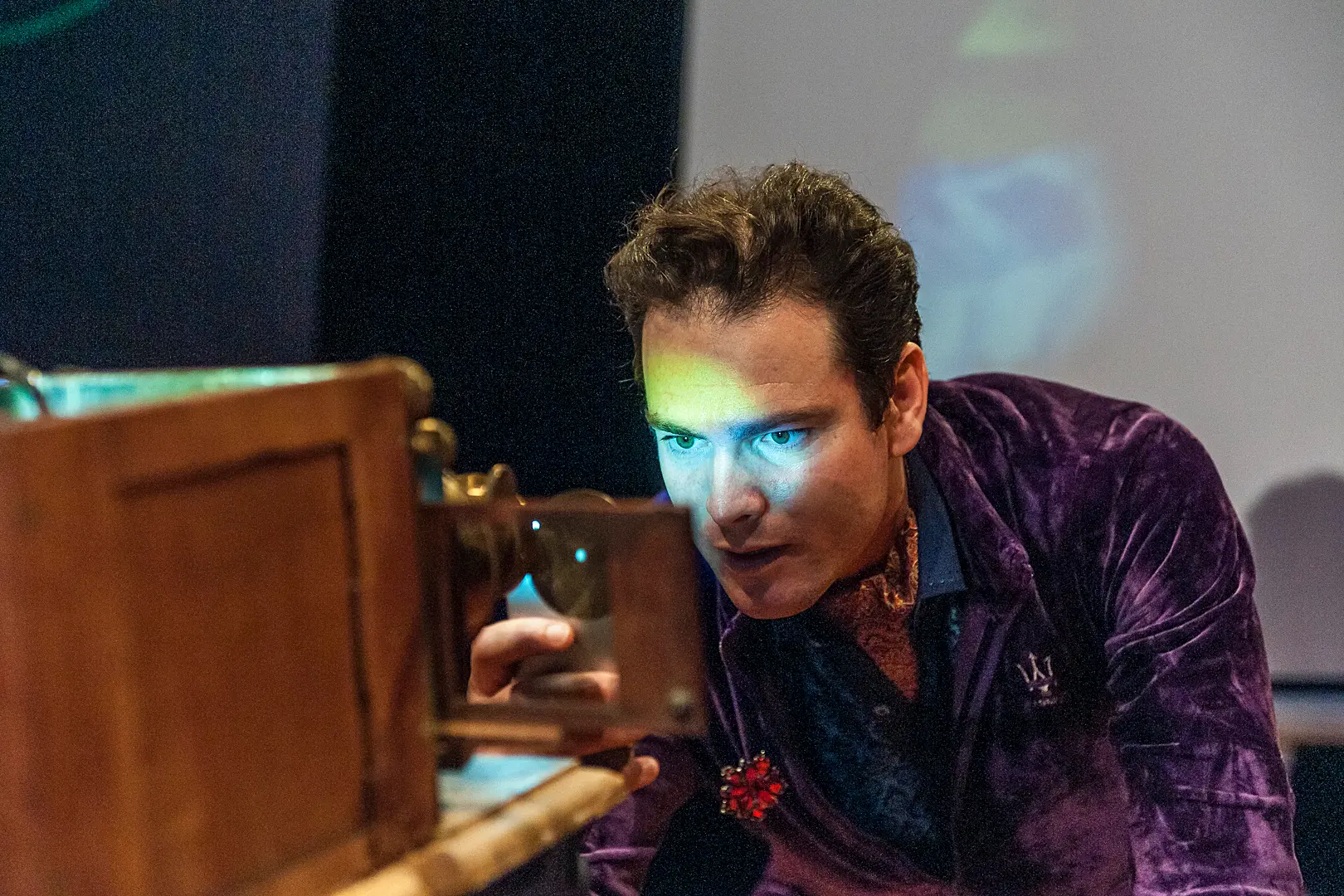 This communal experience, and a sense of wonder at the novel manipulation of light and image (be it manual or digital), is a core feature of this show. We are explicitly acknowledged through genial direct address as an active audience whose role it is to be entranced and enlightened. There has obviously been a rewarding workshopping process – Meek himself professes that he is still learning the machine’s tricks and patterns – because the capabilities of phone and projector, as physical artefacts and image-makers, are beautifully explored and exploited. Shadow-puppetry offsets the digital manipulation of selfies; the phone’s camera exposes detail on the intricate slides, creates characters out of our environment, and reveals unseen details on the set; image and video are recorded are re-looped. I admit that I am happy to see this on the fourth night of its run, as there are very few hiccups with the complex set-up. Instead the performers, as well as the musical and visual technologies, all feel like constituent components within the whirring machine of the play itself. (That said, I'm pleased to have sat near the front; as with almost every show I’ve seen in the Great Hall this festival, sight lines can be pretty treacherous.)