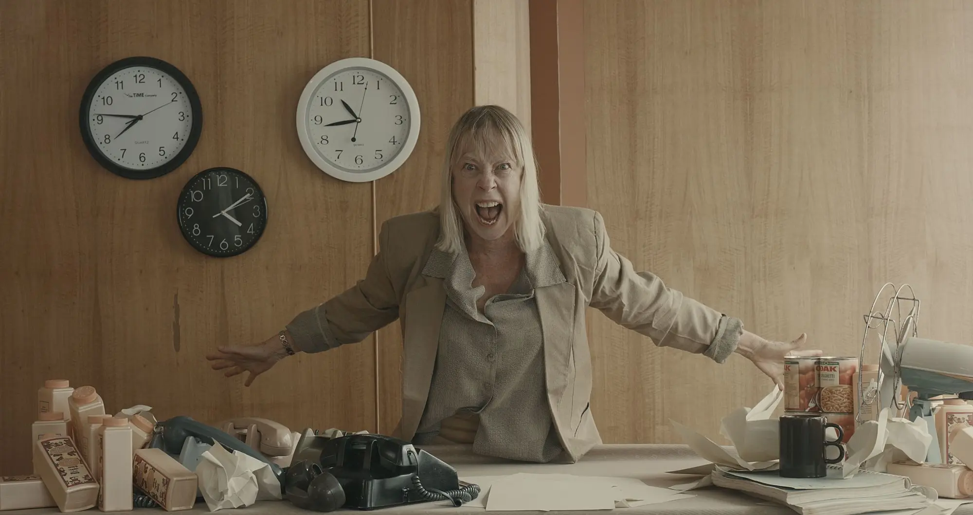 Robin Kelly’s beautifully-executed sound design thickens the atmosphere. Played through tinny mid-2000s computer speakers, his music often comes from different places, never predictable, often playing over itself. The cacophony pulls you in and out of the action but the boardroom staging places us directly in it, denying us the option to shy away. The actors use the opportunity to get close to us, sitting beside us, skulking over us, invading our personal space. This layering makes me uneasy and on edge; as the scenes progress, the dissonance builds and the dialogue contradicts itself and we’re thrust into chaos.