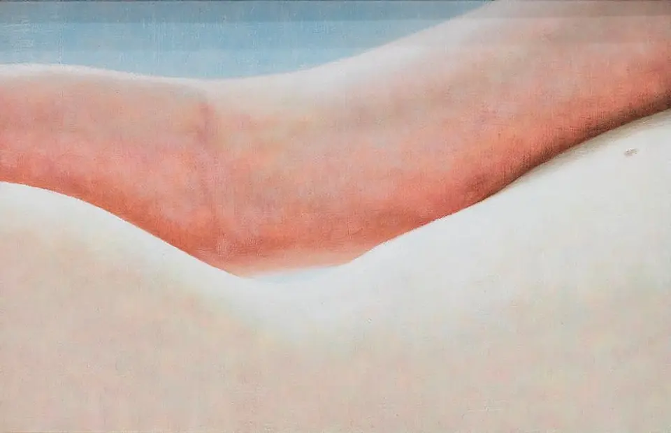 The curation tells a story that moves from abstract to concrete. The first painting in the series has smooth blotches of soft pink, slightly yellow and white in places. A cluster of tiny brown dots and a small oval seemed like random details until I realised I was looking at freckles - maybe a bellybutton on a stretched, flat tummy. This skin seems a healthy red – the blue from the light “has been sucked away into epidermal strata,” as Knox writes – unlike the skin in the next painting, which appears as water, made of dilute blues and purples.