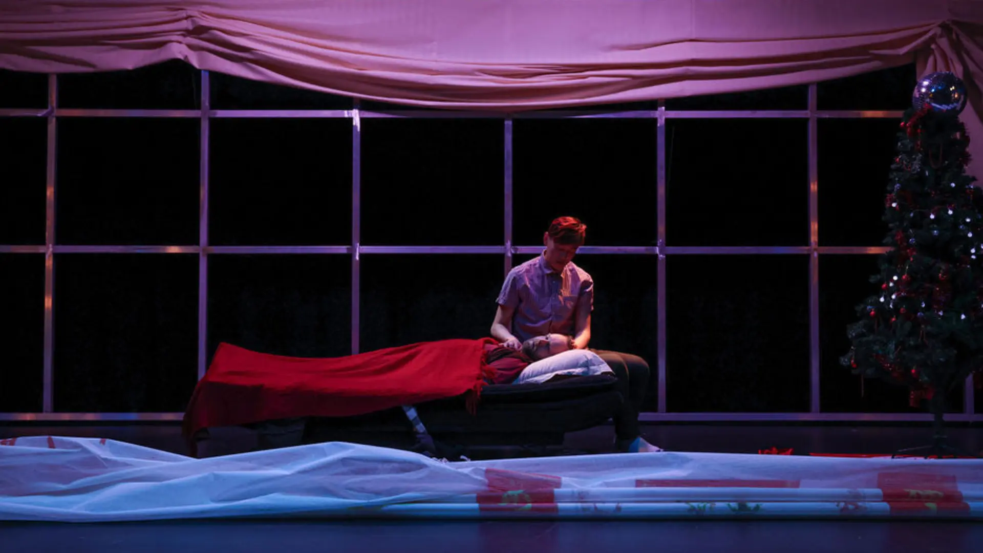 Danny Lam as Shawn, sits looking over Andrew Ford as Mark, who is lying in bed. Photography: Amanda Billing
