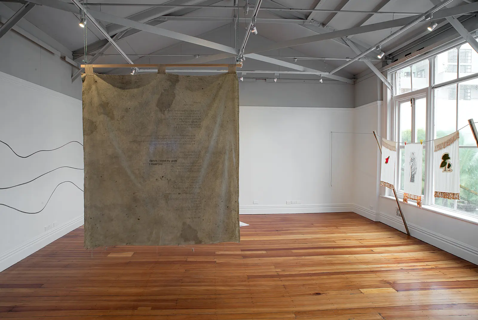 The first work in Namesake is a suspended cloth made of natural cotton and dyed using Kawakawa by Quishile with the words Before I loved my gods. I loved you. Hung on plywood it is fastened to the ceiling via rope. This is the first time Quishile used Kawakawa, in the past she has used other natural ingredients like Haldi (Turmeric), vegetables and clay on natural fibres like cotton. I was only recently told that Kawakawa was used by Māori in mourning ceremonies. I had primarily known of it being used for Rongoā or medicinal purposes, namingly tooth aches, bruising, stomach pain and anxiety relief. Pare Kawakawa (head wreaths) was and is still sometimes used during Tangihanga (Māori funerals) and also where to mark the death of a loved one. The Kawakawa gives Quishile’s work an off green colour that isn’t consistent, staining it in speckles of a dark green that looks almost black, with threads dangling at its ends. The smell of this work wafts through the gallery and on the back, is a text outlining the origin of Quishile’s name. Quishile’s first name is her Aaji’s name, which is ‘Shile’. Her last name ‘Charan’ was split by the British when her ancestors were taken from India and forced to work harsh labour in Fiji. Last names are a western concept. At the ports the British split the first names, as a means to enforce control. To carry someone’s name is to carry the weight of their memory. The artist continues in the tradition of textile making like her Aaji and in her practice continues to acknowledge the bodies of knowledge passed down to her and the legacy of colonialism.