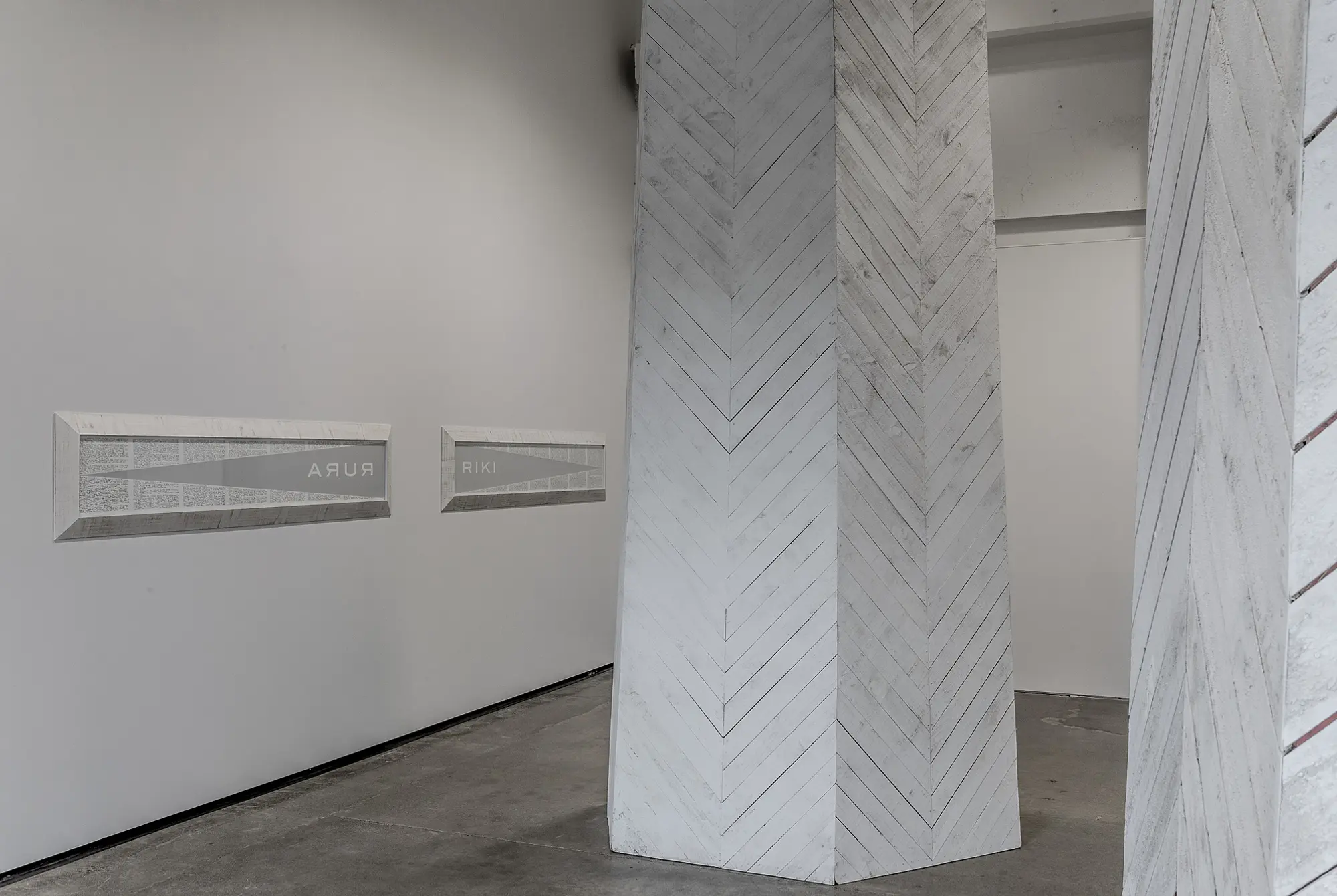 The poles themselves are set to perfectly match the Parlour Projects flooring and pristine white walls with a rubbed white finish; ‘whitewash’ some might say. These structures are clad in wood from the region to evoke houses from the period and are, as Graham describes in his statement, “symbolic of the fact that the ‘Hauhau’ had occupied not a redoubt or fortified position but were in a ‘papa kainga’, a domestic dwelling unsuitable for defence”. Not only are the poles temporary, but the paint grips the rough wooden finish with featherly-fine delicacy.
