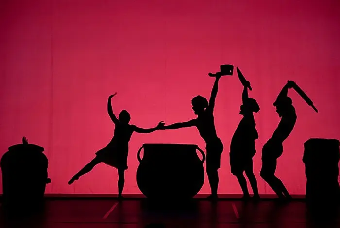 The Civic stage has been stripped back for Pilobolus dance company’s first full-length show, Shadowland. There’s a plain screen upstage, props are strewn around the edges and three costumes hang from the roof like shells of characters, which in retrospect seems depressingly prophetic.
