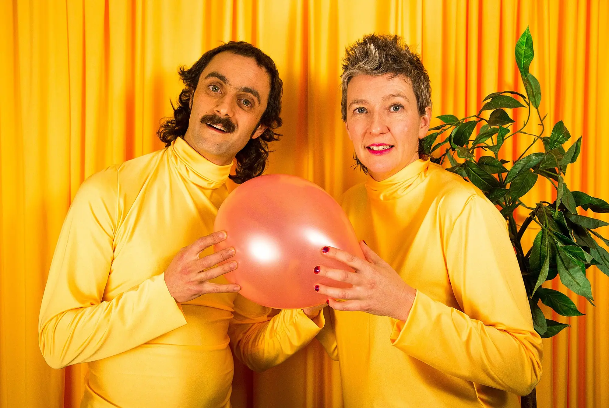 Randerson and LaHood quite literally wrestle with the construction and the performance of gender. Their first characters are abstract and heightened suggestions of the heteronormative ‘male’ and ‘female’: a silky gold hoop of fabric ruffling and slipping its way around, discovering its boundaries to the soothing yet hilarious 'Only Time' by Enya; and a bombastic black rubbish bag figure, literally full of hard air as it marches around the stage. The two performers then slowly construct their gender. A pair of pale pink heels transform softness into 'Her'. A lounge chair and beer bottle help hard to become 'Him'. The fabric is pulled down and becomes a dress; the rubbish bag is deflated to reveal a hirsute chest. Eventually they reveal their faces and the fun truly begins.