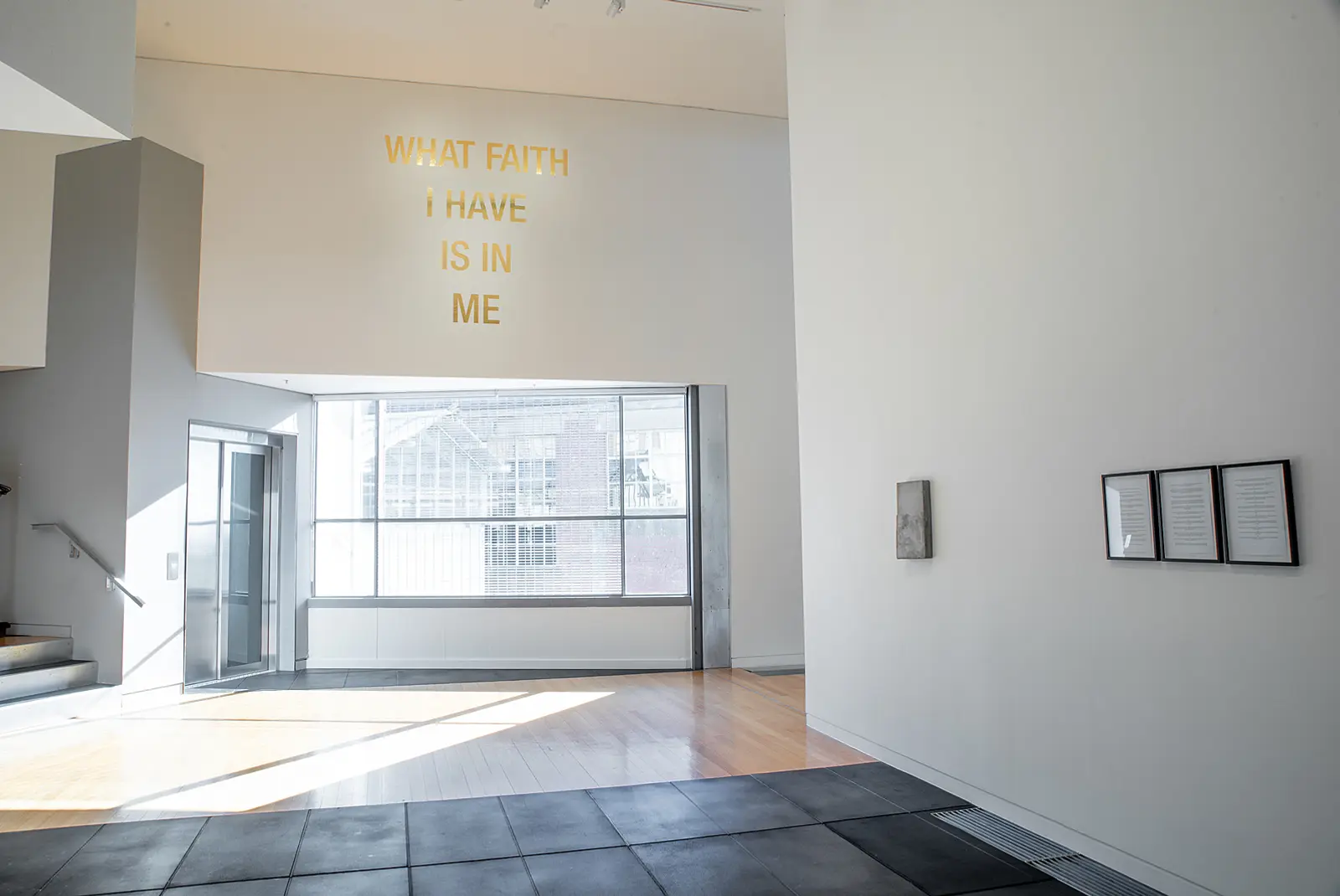 Sitting idly above 1991 is Deborah Rundle’s What Faith I Have (2012/2017). Glossy golden capital letters command only the attention of those looking up (which, admittedly, was not me at first). Rundle’s statement: ‘What faith I have is in me’ has been inspired by Oscar Wilde’s De Profundis, written while doing hard labour for committing homosexual acts in the late 1890s. Imprisoned at the age of 41, Wilde lived his twenties and thirties as he is remembered today; as a future-thinking, lively and charming young aesthete who is celebrated for contributing immensely to poetry, theatre and literature. In this position, however, Rundle’s statement draws on Wilde’s ‘confraternity of the faithless’ – it consciously critiques today’s neo-liberalist ‘me society’. Rundle’s emergent solo practice (and that of Public Share, the collective she is a part of) often focuses on material labour and the counter-productivity of capitalism. Beyond the Adam, Rundle’s recent solo exhibition at Play_Station in Wellington involved a more thorough investigation into these themes. Her presence in The Tomorrow People, while thematically fitting, seems to function like much of the smaller works in this show – as an index of emerging artist to watch closely.