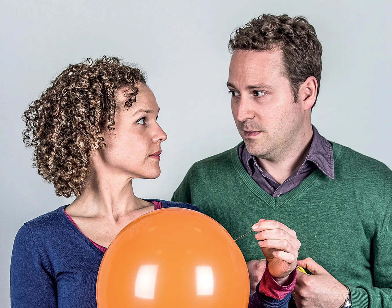It’s to their credit that Dyson-MacGregor, McEvoy and director Geoff Pinfield seem interested in the pursuit of those truths more than anything else, and this is reflected in the beautiful way that Two Mortals flows and moves. Facebook comments loop and cut into each other, fears and desires tossed into the void to compliment and reflect everything else; balloons are thrown into the house-lit seating block, the audience encouraged to bat them about; members of the audience are asked what they’d do if they had two hours/days/years to live, death made fun by the balloon party around it. Dyson-MacGregor and McEvoy re-enact interviews in tandem, sometimes in-sync, sometimes cutting over one another. They editorialise, verbally (jumping out of the interview to ask rhetorical questions about dealing with death) and physically (as when Dyson-MacGregor pulls McEvoy around the stage during the mortician’s interview, trying to control him as he flops around in a particularly gross way). Pinfield’s got a knack for injecting this kind of surging, playful energy into dense, text-heavy shows, as we’ve seen in the likes of Real Fake White Dirt and On The Conditions And Possibilities Of Helen Clark Taking Me As Her Young Lover, and it makes all the difference here.
