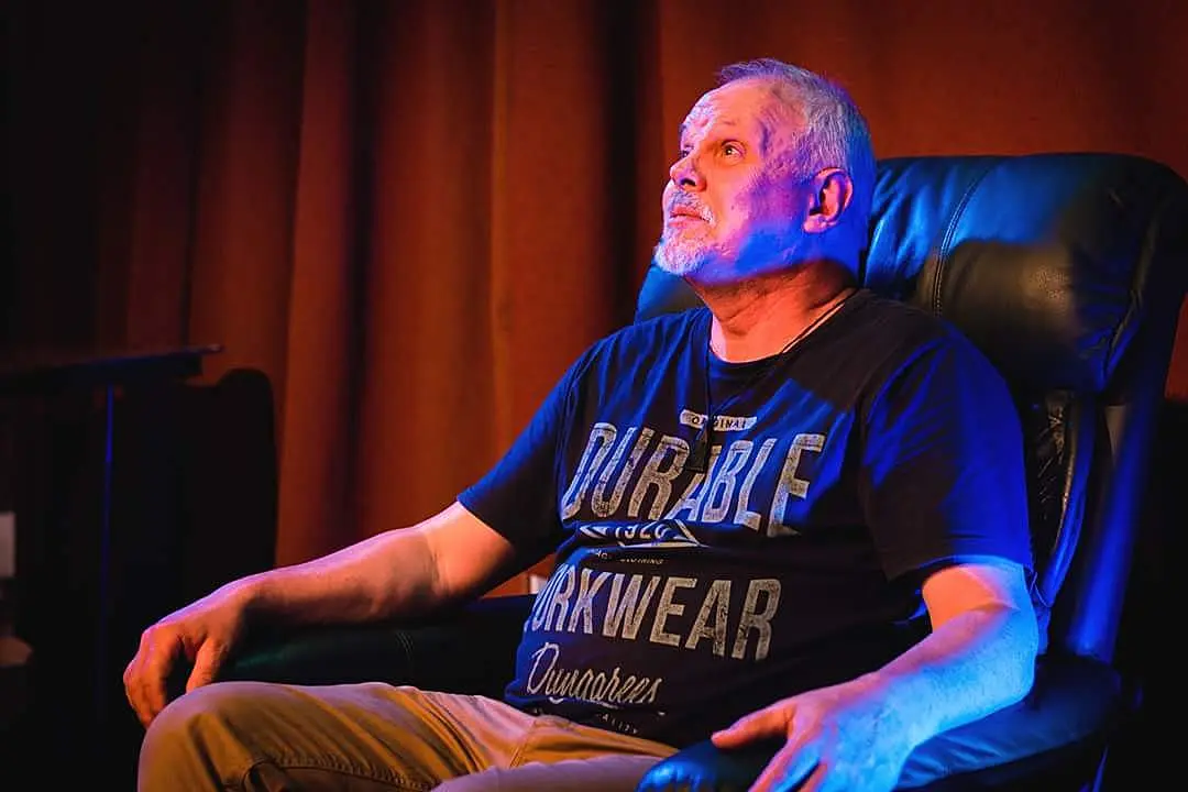 Chris Green plays the man. He’s got an unpretentious look, with close-cropped grey hair, a dark t-shirt and khakis; his voice is deep and slightly strained, like it has some history to it, and it gives his monologue texture. Director James Cain leaves his performance largely unvarnished – there are few flourishes in the blocking and the set, a lazyboy and a Warehouse bookshelf with some old books, is appropriately utilitarian. But when Green is at his most nostalgic, recalling beautiful, deeply-cherished parts of his and May’s life, Cain builds on the romance: the space sinks into blue and Will Evans’ dreamy synth compositions drift underneath.