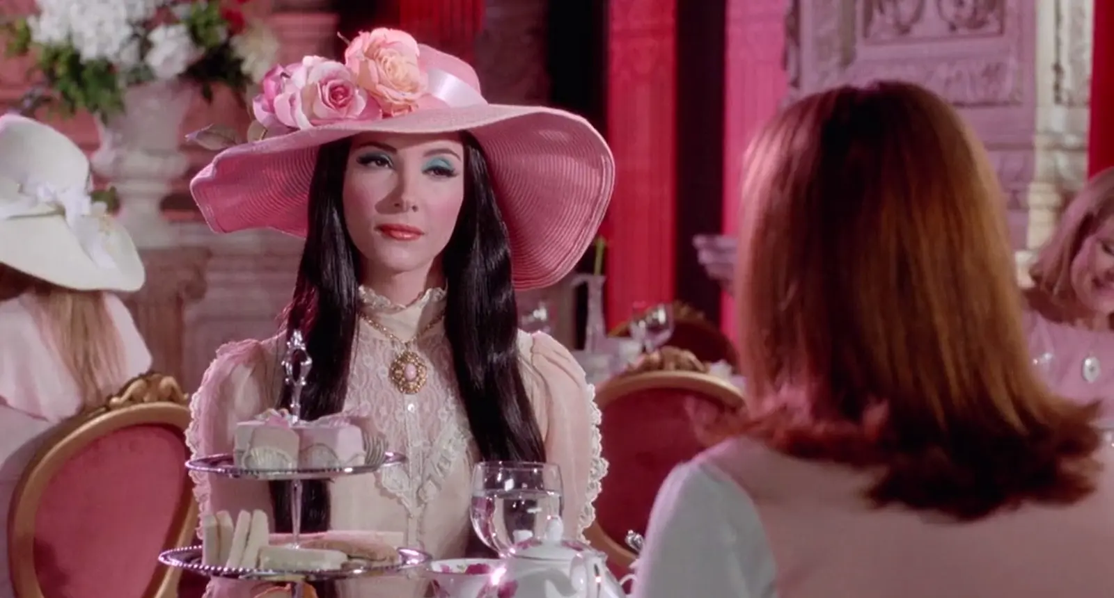 As such, claims that Elaine’s well-coiffed 60s bouffant, plunging necklines, cat’s eye makeup and creamy, shimmering eyeshadow are apolitical and simply an aesthetic choice don’t account for what we might bring to the film and our understandings of what this look has signalled over time. When the camera zooms in on Elaine’s eyes and she looks back at us alluringly, is she Marlene Dietrich in Morocco challenging the audience’s objectifying gaze, or is she a knowing, even absurdist take on the femme fatale by way of a gauzy, kitsch Les Baxter album cover?