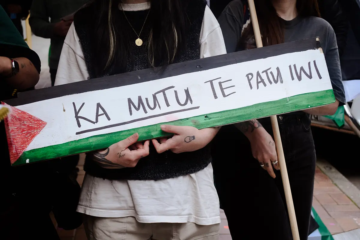 In Civic Square, I proclaim that we are not afraid. I want to convey confidence and hope. Organisers take responsibility for showing leadership in the face of uncertainty and despair. Of course, the truth is I wake up every day terrified for Gaza and for us all. I shake, I doubt and I question, but am held steady by collective memory and courageous collective leadership. “The land remembers. We remember,” says Green MP Teanau Tuiono on the steps of Parliament.