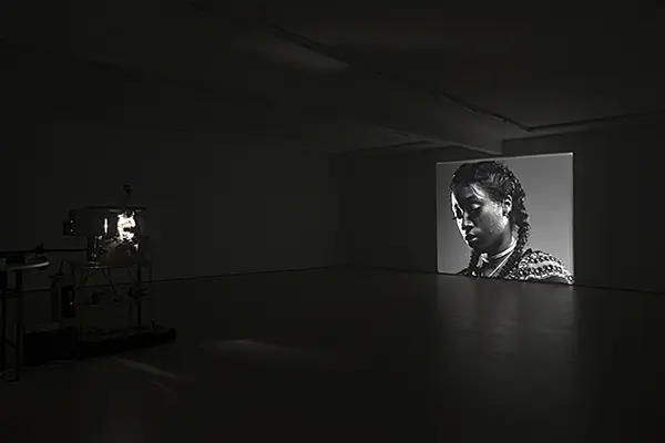 It’s with similar intent that Thompson describes autoportrait, his most recent work, as a “sister image” to a Facebook Live video broadcast by Diamond Reynolds in July 2016, after her partner Philando Castile was shot by a police officer during a traffic stop in Minnesota. The Facebook video records Castile’s last moments before his death and was viewed millions of times before it was taken down. Autoportrait is a 35mm black and white film portrait of Diamond Reynolds, who stands in intimate distance with the camera, still and quiet (one take is silent, while she sings softly in another). A week before the work debuted at the Chisenhale, the police officer who shot Philando Castile, Jeronimo Yanez, was acquitted of manslaughter.
