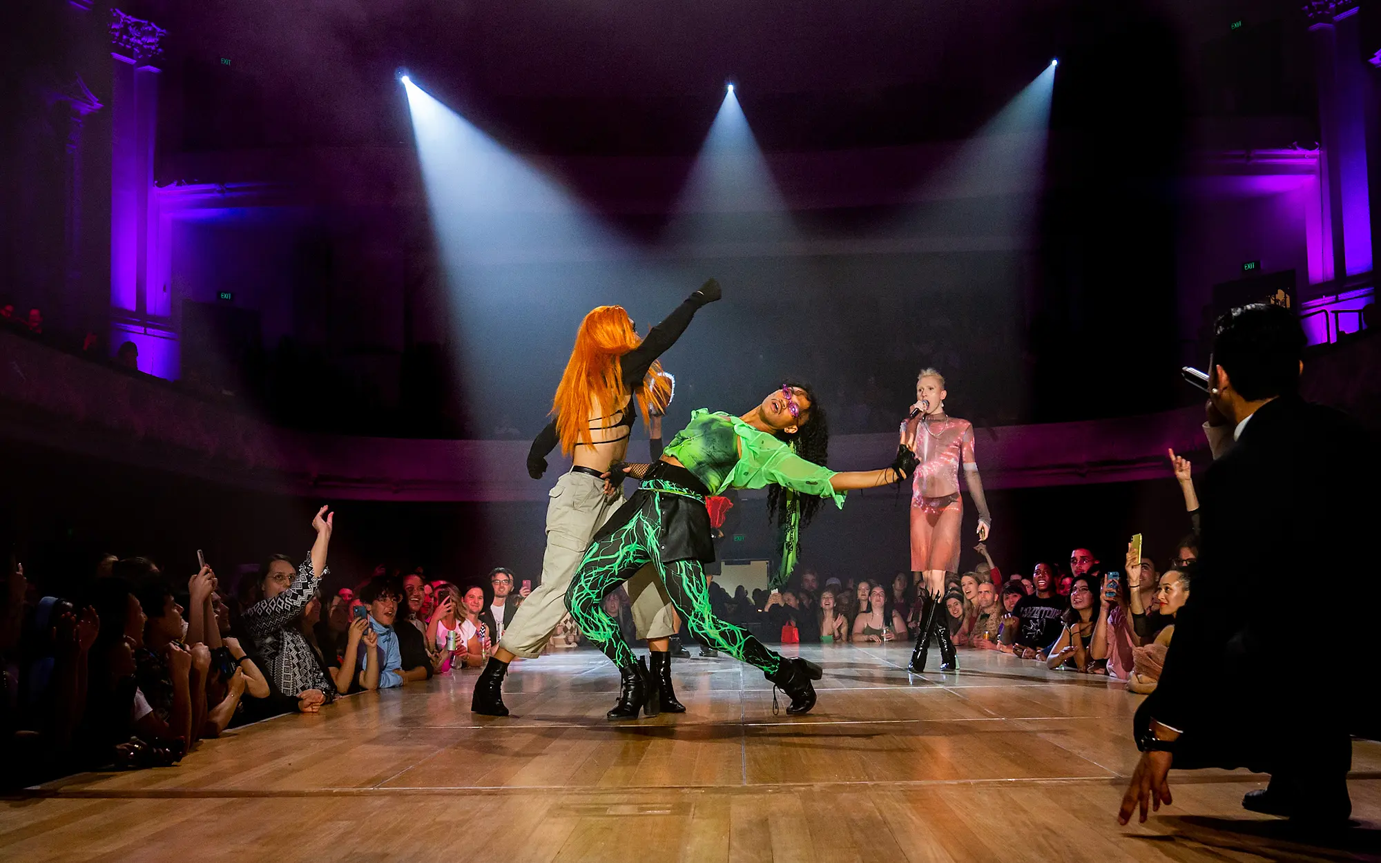 For the Tag Team Performance category, walkers vogued in pairs, dressed as animated duos from computer games and cartoons. They darted around each other in colour-block miniskirts, lunging through tiny slivers of space. Duckwalk as the music ebbs, then dip at the climax of the beat, limbs falling up as their head smacked down to the HA!