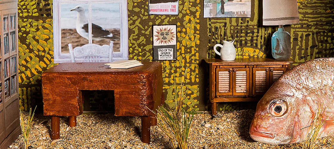 Te Pō is nothing like a Bruce Mason play. There’s a three-act structure, sure, but it borrows heavily from farce, and director Ben Crowder sprinkles whimsy and magical realism all over it. Crowder likes that “a lot of what is written isn’t very possible to put on.” The set of Mason’s study, designed with superb attention to detail by Andrew Foster, is full of surprises. Chairs move on their own whim. A piano plays typewriter taps instead of chords. The characters have no concept of a fourth wall, and are compelled to share their thoughts, often stepping outside the stage frame. There are animals, too: a seagull, a big fish, and something else quite unexpected, designed by Main Reactor and operated by Ella Becroft. It is difficult intellectually to explain what’s going on with these creatures in the play, but they certainly connect on a purer emotional level. Bland sees them as witnesses “to these stupid humans around them… they are like God, just watching, wondering.”