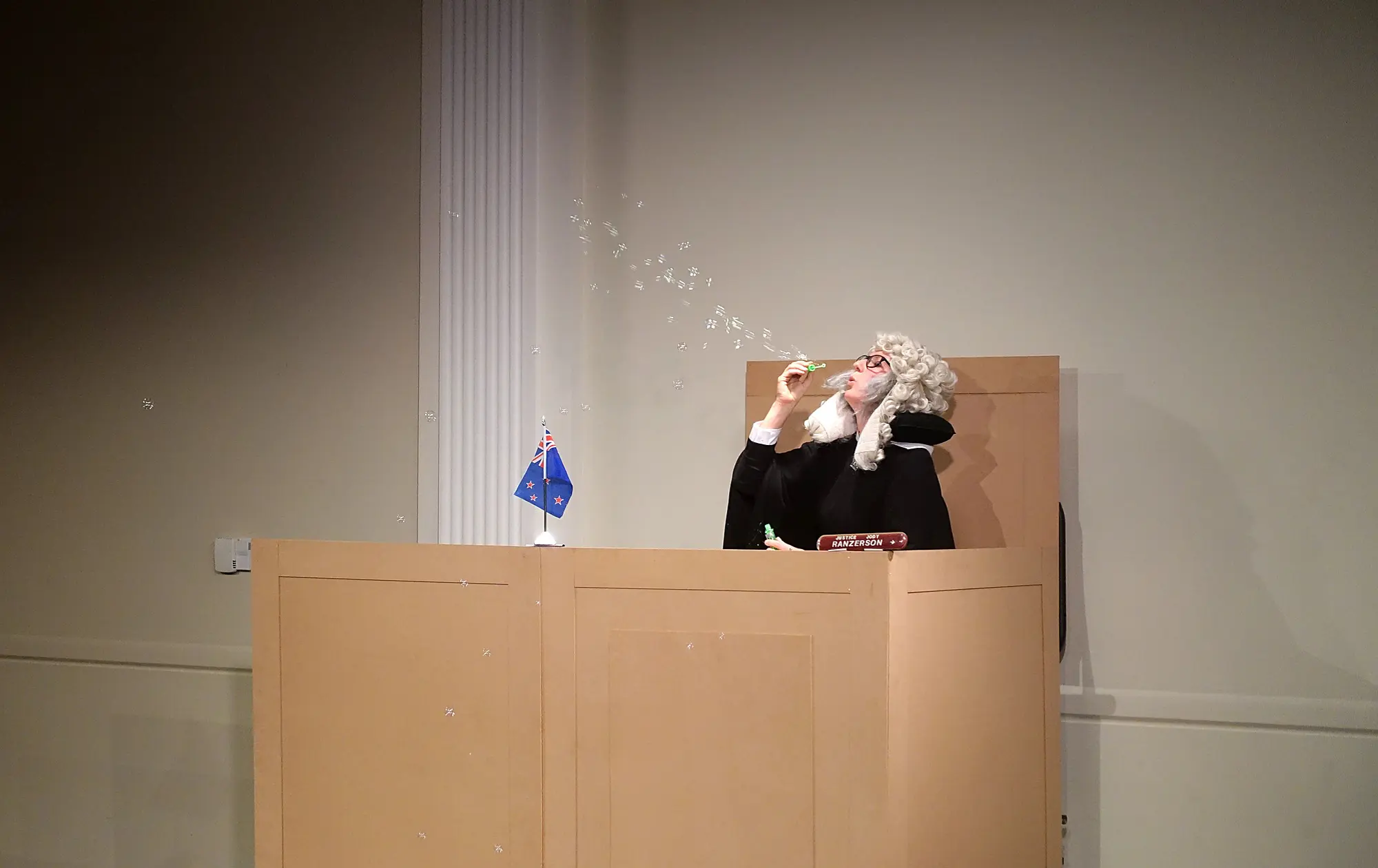 The night I saw Binge Culture and Barbarian Productions’ A Trial, a gloriously silly take on the contemporary defamation trial, pollster and Kiwiblogger David Farrar took the stand to testify to the soundness of the Kiwimeter poll. The plaintiff, TVNZ, had brought proceedings against an unnamed Twitter user for calling their poll racist. Farrar was a witness for the plaintiff, and Joel Baxendale, acting as TVNZ’s bumbling counsel, peppered him with softballs about statistical methods, Farrar clearly enjoying the opportunity to lecture the room. Then counsel for the defendant, Karin McCracken, stood and methodically dismantled all of his arguments, pressing him on why, exactly, a legitimate poll would need to reinforce racist and colonialist attitudes as ‘patriotism’. I don’t know whether Farrar was briefed that this would happen, but it doesn’t really matter because it was real when his face went deep red, and it was real when, minutes later, half the courtroom started dancing to ‘Love Don’t Cost A Thing’. A Trial was a striking use of a format that’s often theatre in its own right, laser-focussed on interrogating the social status quo with detail and disrespect, and never losing its ludicrous, inclusive spark.