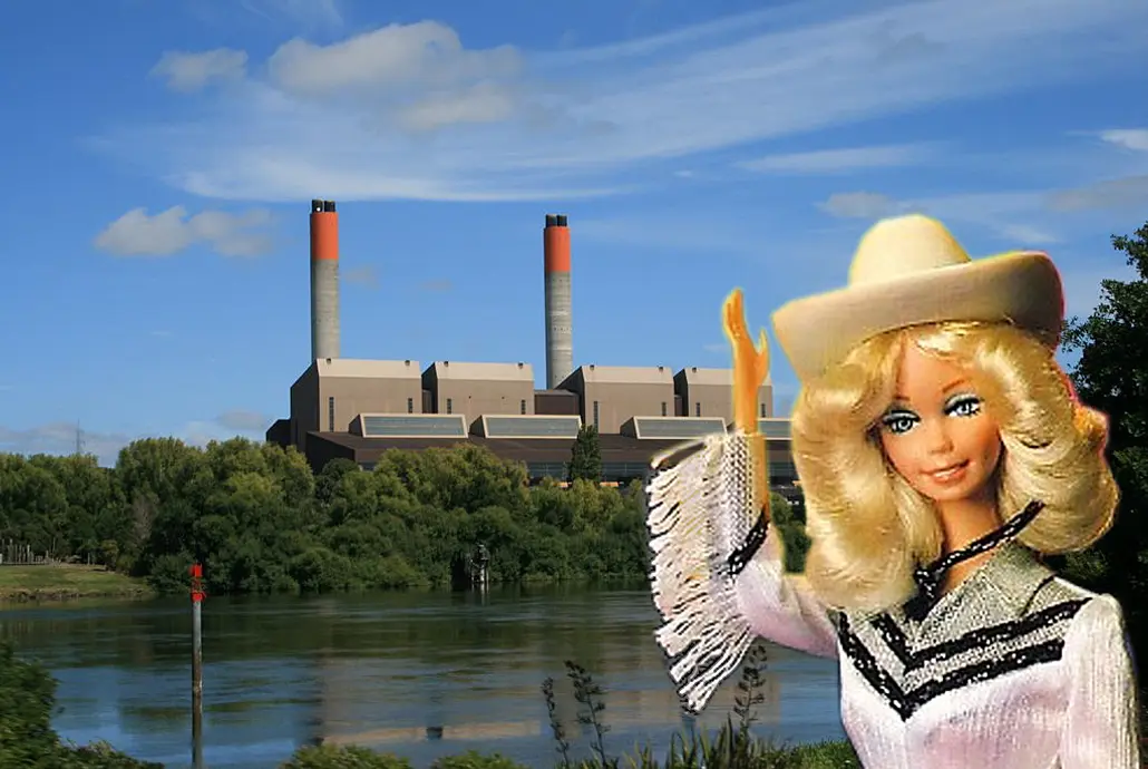 On Sunday afternoons, Mum took long walks. Barbie saddled up Dallas and we trailed along. We crossed the rusted railway bridge to the other side of town. The trains seemed infrequent, the business they were designed to do long overtaken. “Whoa!” Barbie pulled on Dallas’s reins. We stopped mid-way across the bridge. Mum stared down at the slow-moving Waikato River. The water was silver where the light struck it, like Western Barbie’s tassels. But most of the time it was just brown and murky. Barbie and I surveyed the Huntly Power Station; its two red turrets poked up into the sky. The steeple of the church also reached into the sky. But the chimneys of the Power Station reached higher.