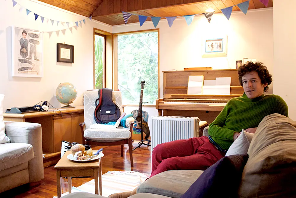 Alex has lived in Devonport most of life, though he left last year for the next suburb over. He now lives at the bottom of a treacherously steep driveway, right in the heart of a Beach Haven Kauri forest. There’s a solitary chicken milling by the front door, a pair of gumboots in the hallway. Out the windows you can’t see any houses, just a lush, slippery green powdered by ashen morning skies. The house itself is dry and cool – cave-like apart from the warm lighting – and is crammed with instruments. The lounge alone has an accordion, a guitar, a violin, a piano.